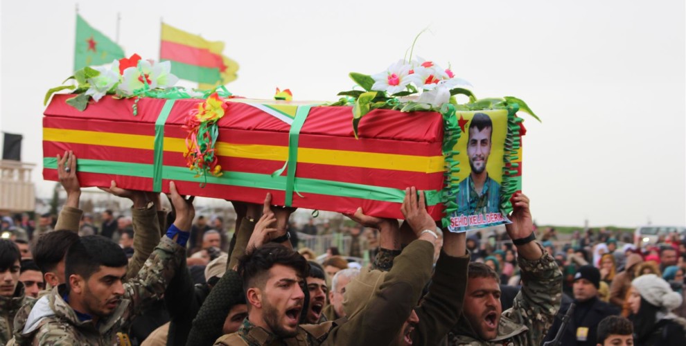 NAVENDA NÛÇEYAN- Bi sedan welatiyên Dêrik û Girkê Legê cenazeyê şervanê YPG’ê Hemza Şiwîş (Xelîl Dêrik) ku 11’ê Çileyê di ‘Pêngava Bagera Cizîrê’ de şehîd bûbû, ji Nexweşxanea Şehîd Hogir wergirtin û bi karwanekî wesayîtan ber bi Goristana Şehîd Xebat Dêrik ve ketin rê.