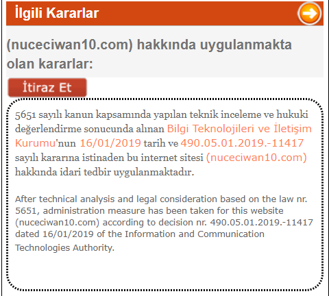NAVENDA NÛÇEYAN- Saziya Ragihandin û Teknolojiyên Agahiyan (BTK) malperê me ya bi navê nuceciwan10.com ku beriya gelek caran hatibû girtin carekî din asteng kir. BTK’ê ji bo astengkirinê ti hincetan biryar nîşan neda. Malpera Ciwanan li hember zext û sansûrên dewleta Tirk berxwedana xwe dewam dike.