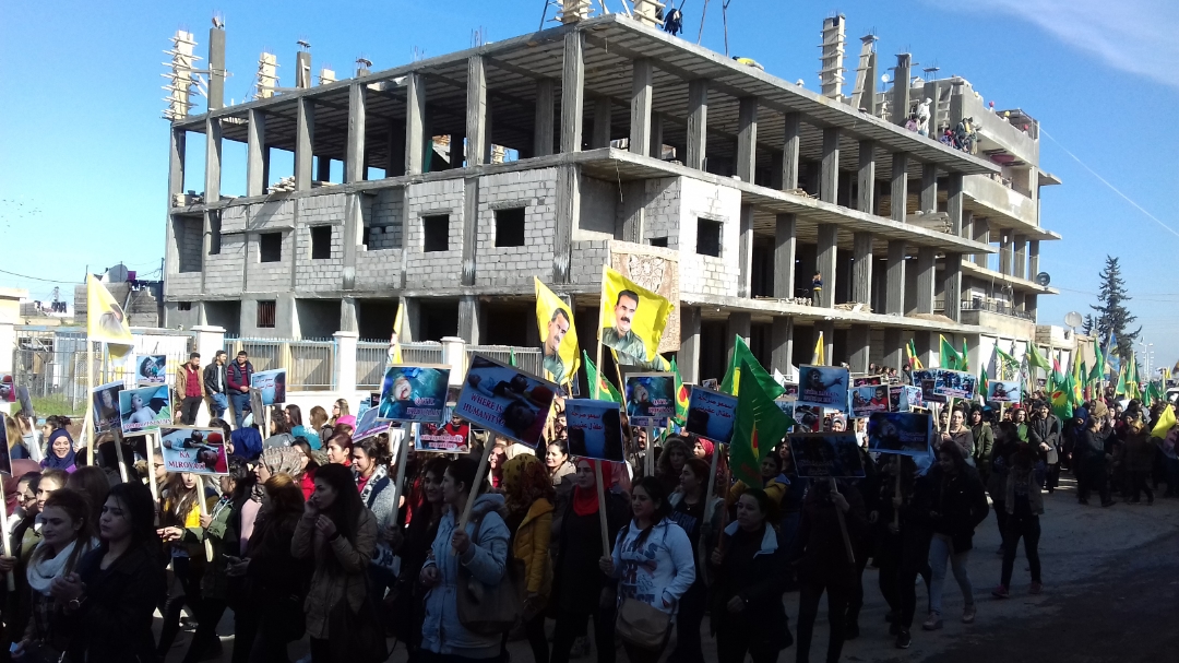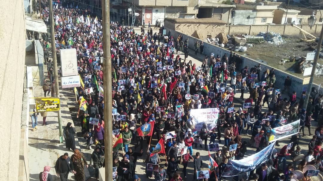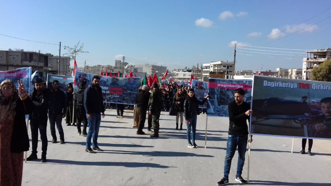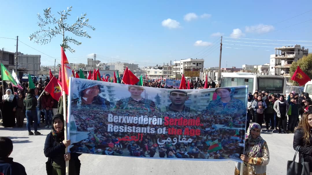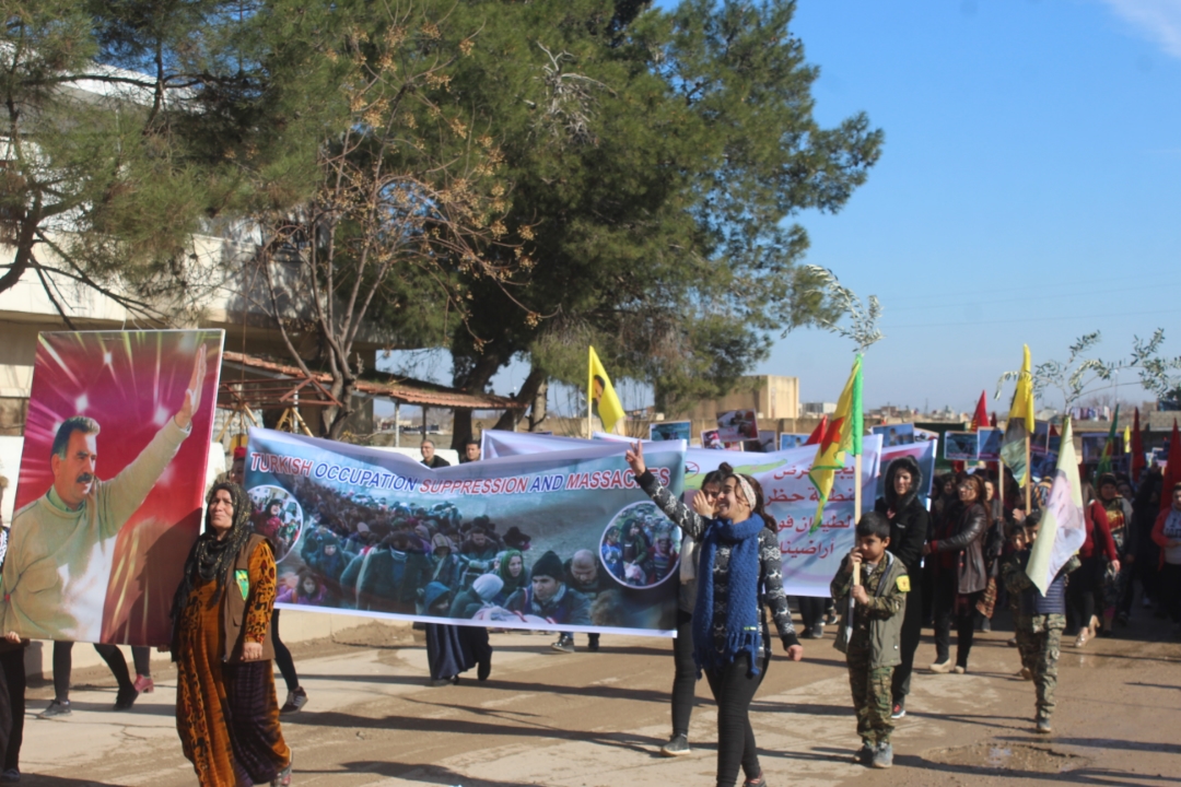 Bi hezaran şêniyên Efrîn û Şehbayê di pêşengtiya Tevgera Ciwanên Şoreşger de diruşmeya “Em ê bi rihê Berxwedana Serdemê Efrînê rizgar bikin û dagirkeriya Tirkiyê biqewitînin” meşekê lidar dixin. Di heman demê de meş li dijî tecrîda giran li ser Rêberê Gelan Abdullah Ocalan jî tê kirin.