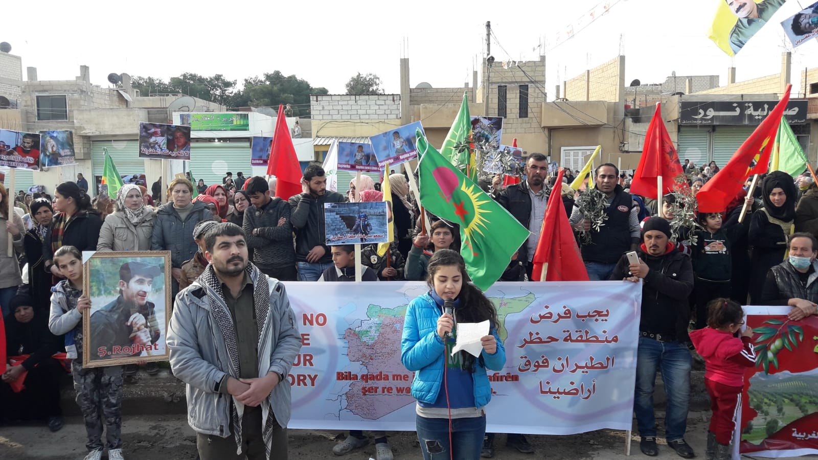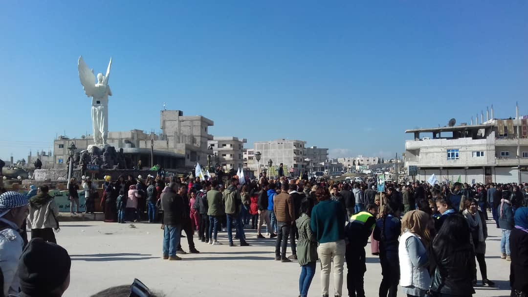 Li Kobanê, ji bo şermezarkirina dagirkeriya dewleta Tirk a li Efrînê û li dijî tecrîdê bi hezaran kes di pêşengtiya Tevgera Ciwanên Şoreşger li meydana Peykerê Jina Azad li hev civiyan. Ji Girê Spî, Sûlûk û ciwanên Eyn el îsa li Kobanê kom bûn.