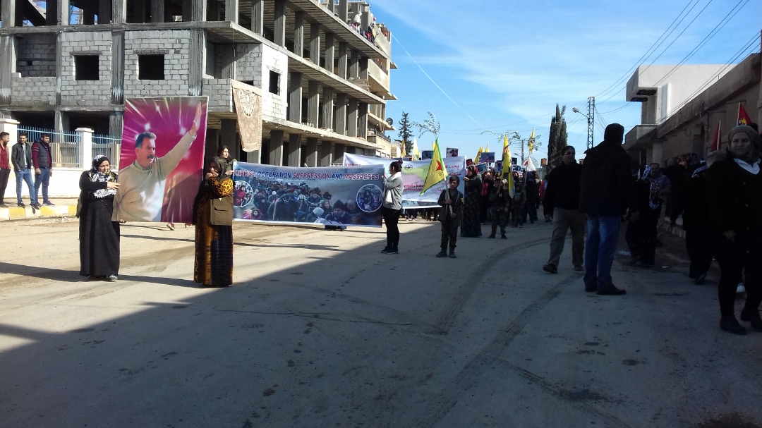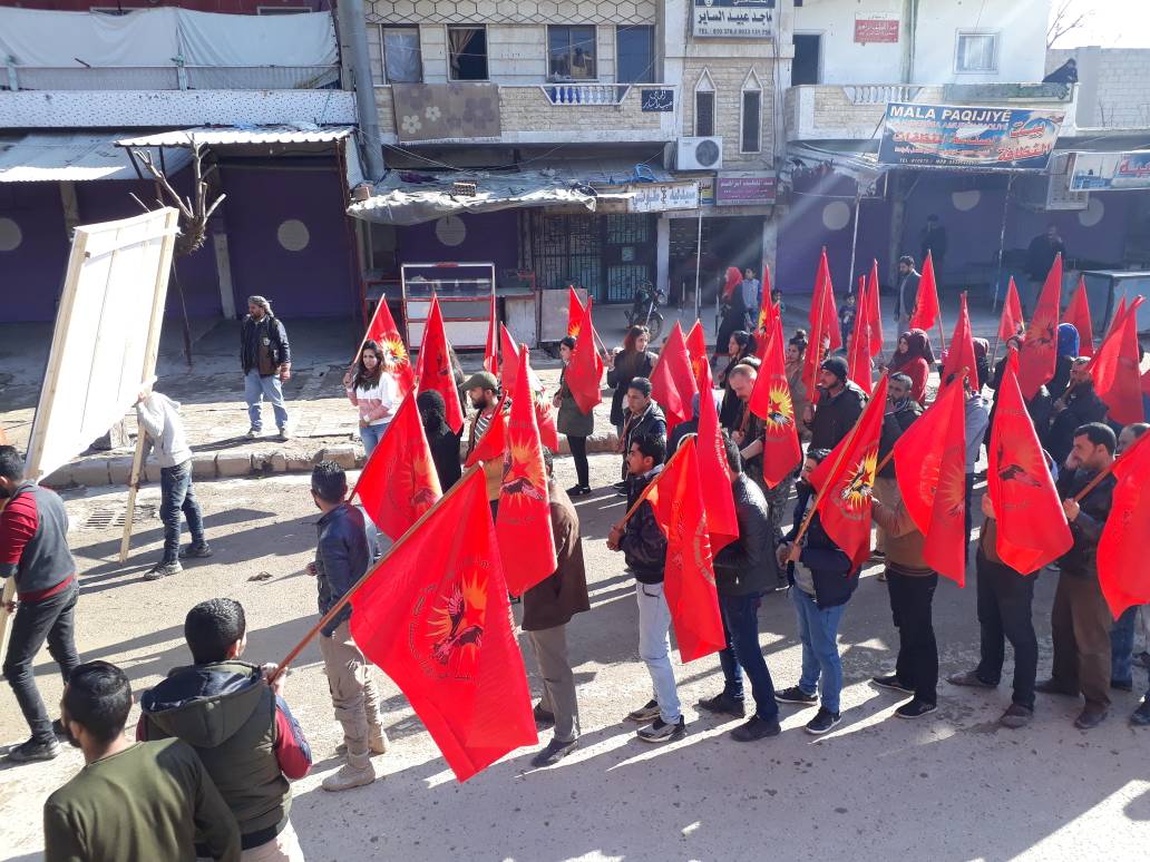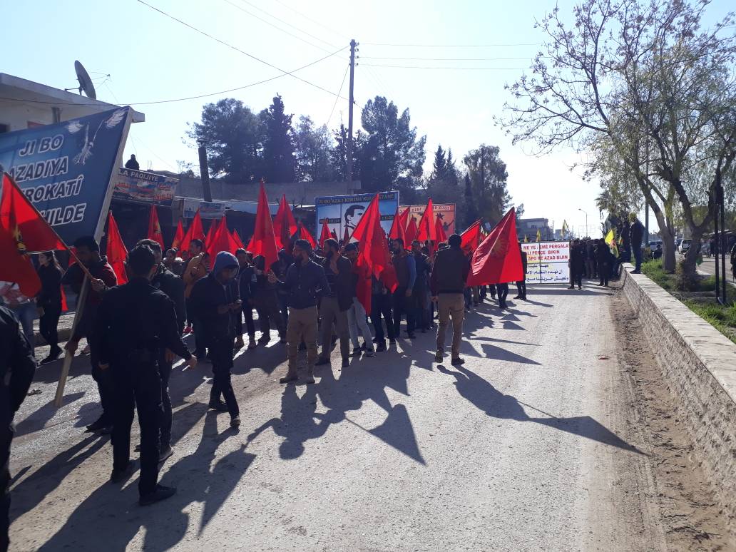 Di pêşengtiya Tevgera Ciwanên Şoreşger meş li ber Qada Azadiyê destpêkir û heya ber bi Peykera Şehîdan a navenda sukê berdewam kir. Di meşê de ji bo Rêberê Gelan Abdullah Ocalan diruşim hate berz kirin. Girse bi diruşma ”Bijî Berxwedana Efrîn’ê” ve meşiyan. Bi sedan kes tevlî bû.
