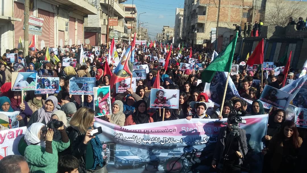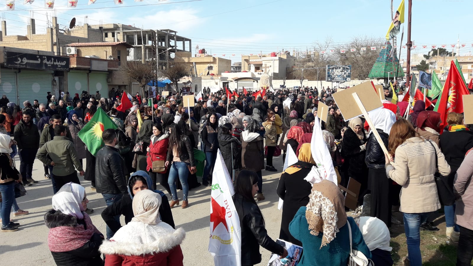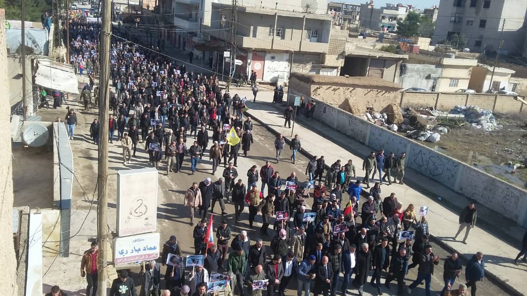 Li Bajarê Qamişlo jî bi heman armancê bi deh hezaran welatî di pêşengtiya ciwanan de li ber dewara şerqê de destpêkir. Piştî meşên girseyî kom bûn. Girseya ku piştî meşê li qada mitîngê kom bûn, pankart, dowîz û wêneyên kesên di şer de jiyana xwe ji dest dane bilind kirin û bê navber dirûşme berz kirin. Mîtîng bi axaftinan didome.