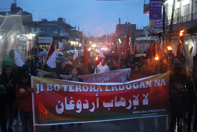 Ciwanan alên Tevgera Ciwanên Şoreşger a Sûriyê pankartên bi nivîsên “Ji terora Erdogan re na, azadiya Rêber Apo mîsogeriya sîstema federal li Sûriyê û Rojhilata Navîn e” vekirin û mişle hildabûn.