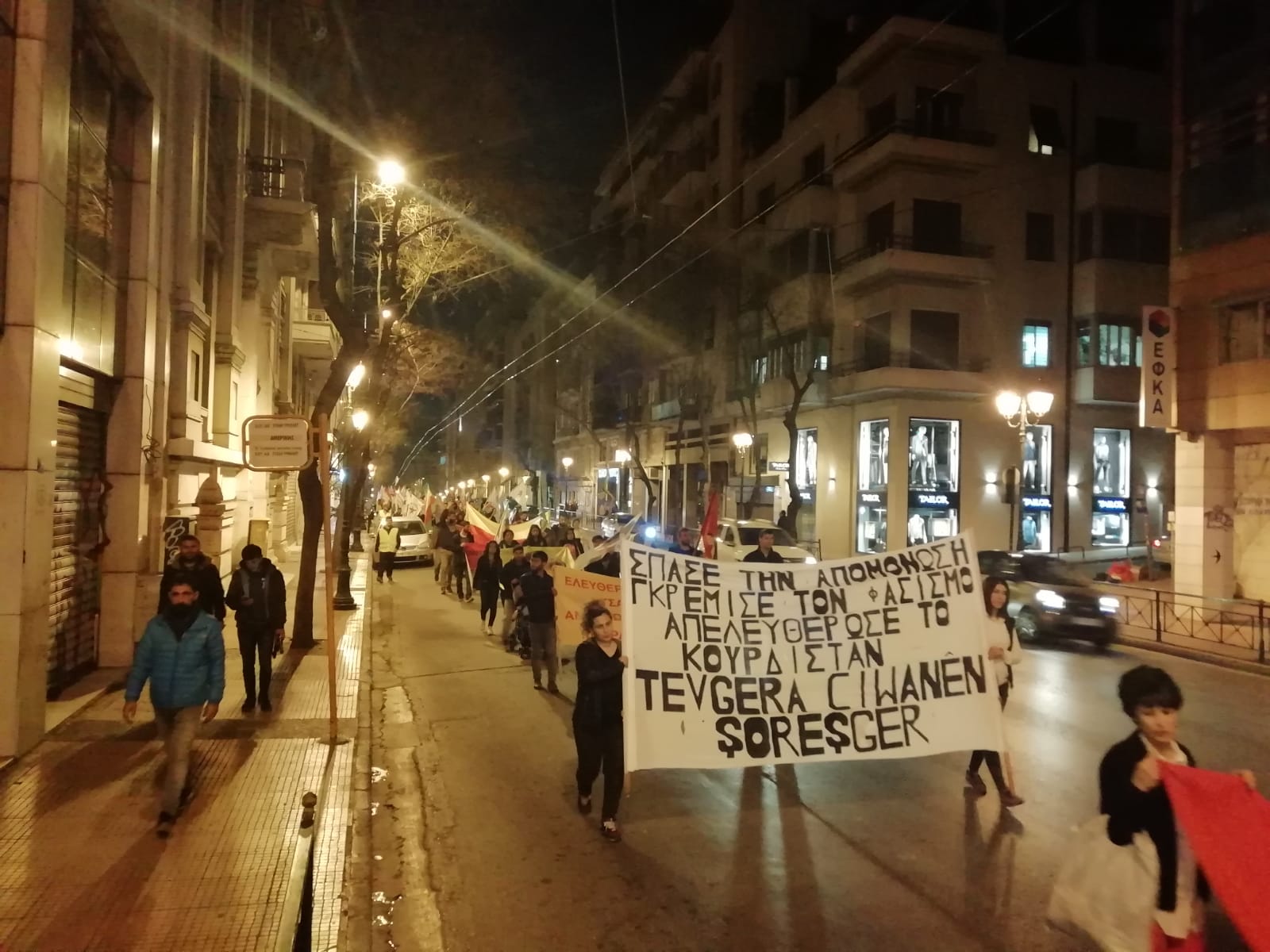 ATÎNA-Meş di pêşengiya Tevgera Ciwanên Şoreşger, Komên Çepgir ên Tirkiye û Komên Anarşist ên Yewnan ve pêk hat. Çalakî ji Zanigeha Polîteknîkê destpê kir. Gelek ciwan û gel bi alên PKK û wêneyên Rêberê Gelan Abdullah Ocalan ve tev li çalakî bûn. Girse di çalakiyê de çalakiya Leyla Guven silav kirin û dirûşmên “Leyla Guven Rumeta me ye”, Bijî Serok Apo”, “Bijî Berxwedana Zindanan” û “Bijî Piştgiriya Şoreşgerî” berz kirin.