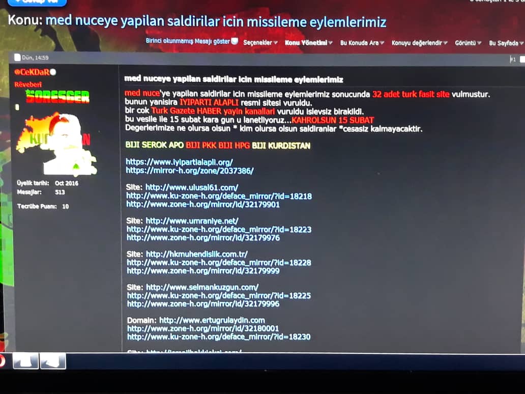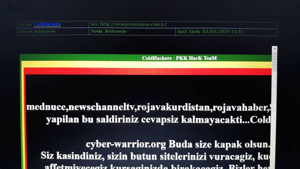“Soza me ji şehîdan re û gelê me yê berxweder re heye ku li dijî tecrîda girankirî ya ku di tu hiqûqê de û mirovatî de cihê wî nîne ya li ser bi taybetî Rêberê Gelê Kurd, bi gelemperî Rêberê hemû gelên bindest û mazlûm, Rêber Apo wek di her qadê de li ser ortema sanal de jî em ê çalakiyên xwe berdewam bikin. Em wek gerillayên sanal ên Rêber Apo di ortama sanal de çalakiyên xwe re bênavber berdewam dikin û dê bikin jî. Bi vê re girêdayê; wek Coldhackers, Mezopotamia Hackers, RojavaHack û PKK-HackTeam, heya ku tecrîd dawî bibe û serarastkirina şertên azadî, ewlehî û tendûrîstiya Rêber Apo pêk were em ê êrîşên herî giran pêk bînin.Em hemû çalakvanên grevên birçîbûnê ya ku di pêşengiya Leyla Guvena ku li gor qanunên TCê bi reyên gelê me yê cefakar û kedkar a Colemêrgê ve hat hilbijartin, hat destpêkirin û ji Strasbourg, Hewlêr, Galler, Rusya, Kurdistan, heya zindanên TCê û li gelek cihên Ewrûpa hat berdewam kirin silav dikin. Em diyar dikin ku bi sedan malperên ku me hack kiriye li ser navê silavkirina di destpêkê de Rêber Apo hemû çalakvanên greva birçîbûnê hatiye kirin û gelek agahiyên veşartî û girîng bi dest xistine. Dîsa em diyar dikin ku li dijî êrîşên malper û rûpelên me, me bi şêwaza lêdana bi hêz ya malperên neyar bersiv hatiye dayîn.”