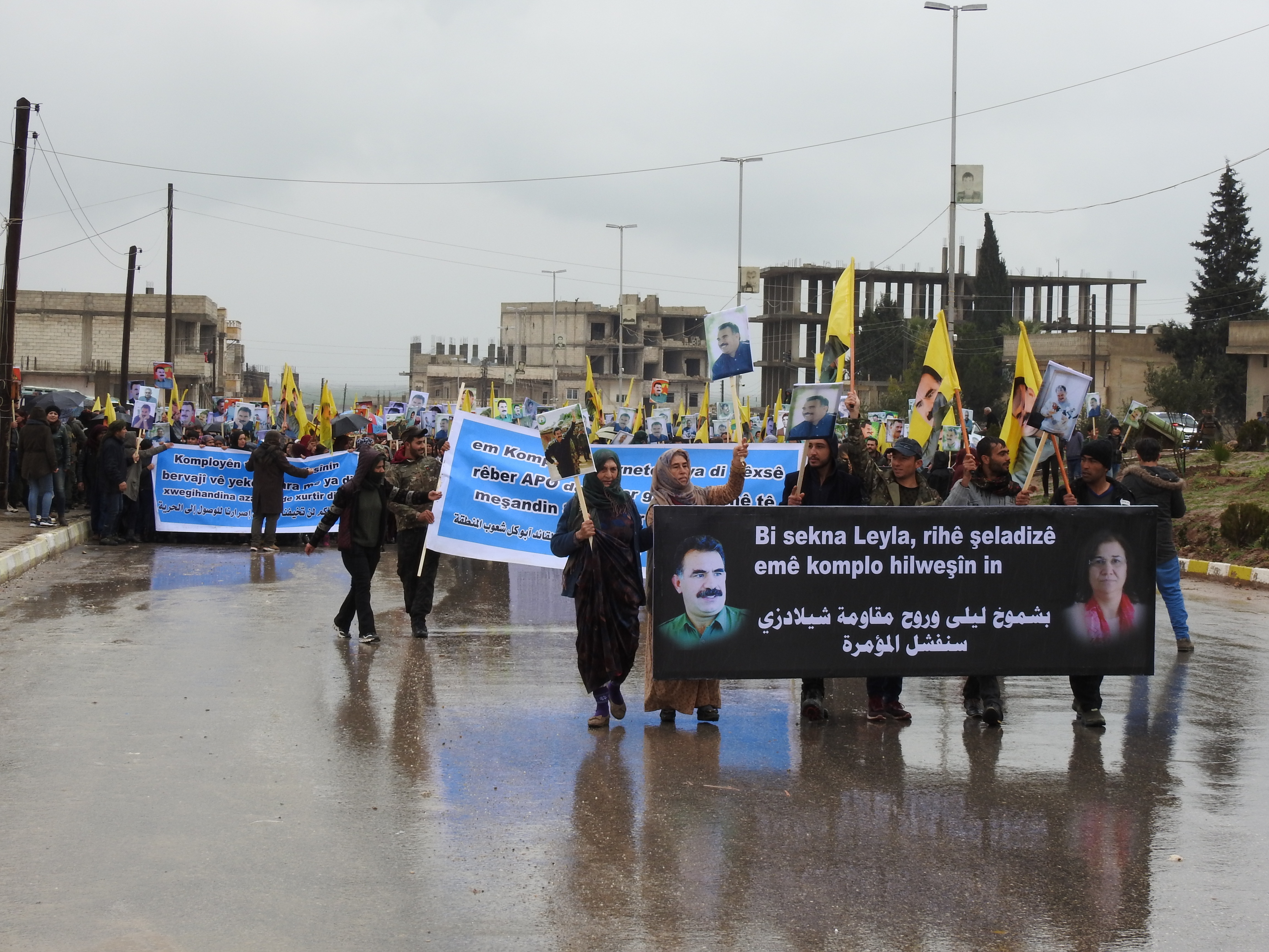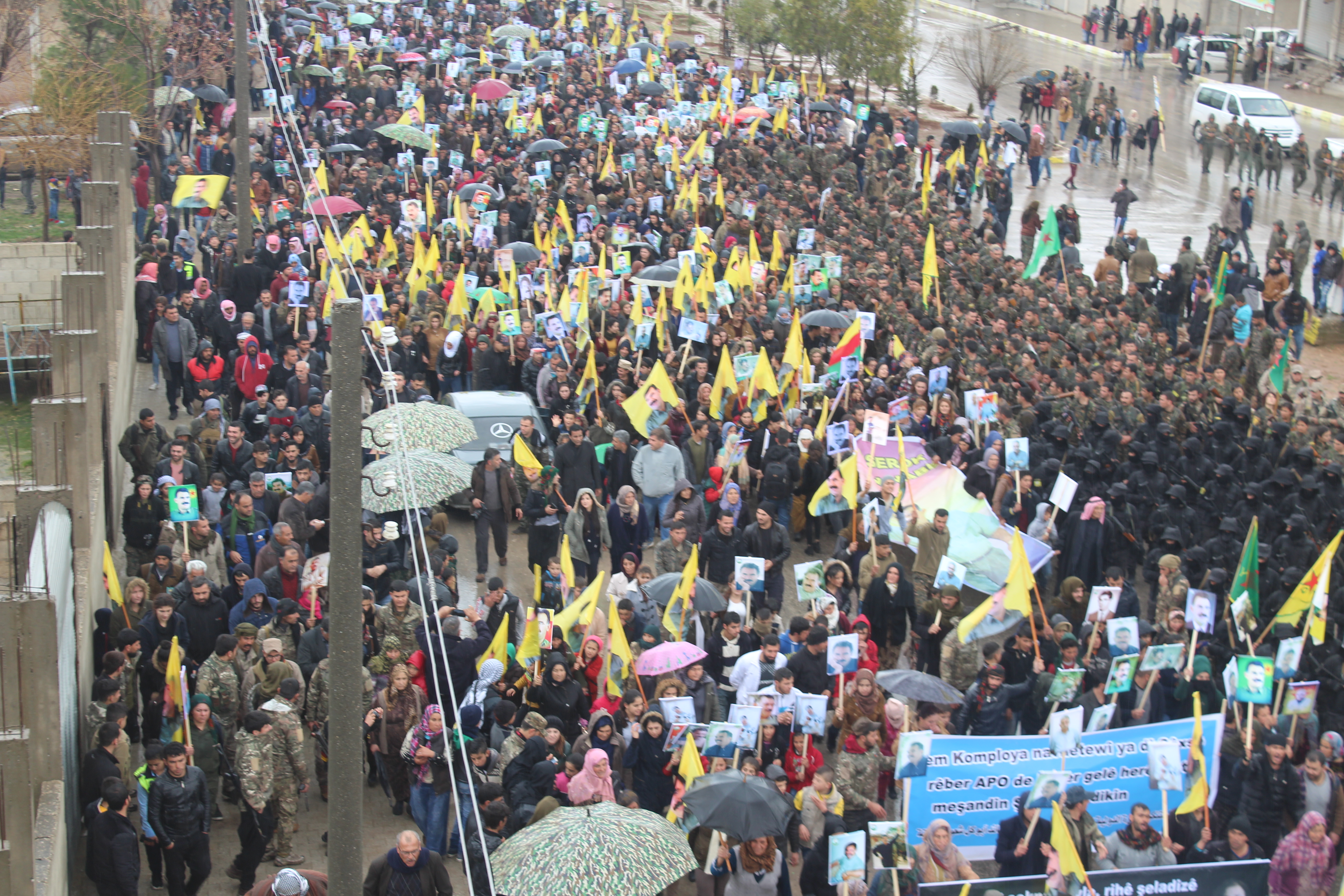 KOBANÊ- Li dijî komployê navdewletî ya li ser Rêberê Gelan Abdullah Ocalan li Kurdistan û di gelek welatên cihanê demeş û mîting tê li dar xistin.