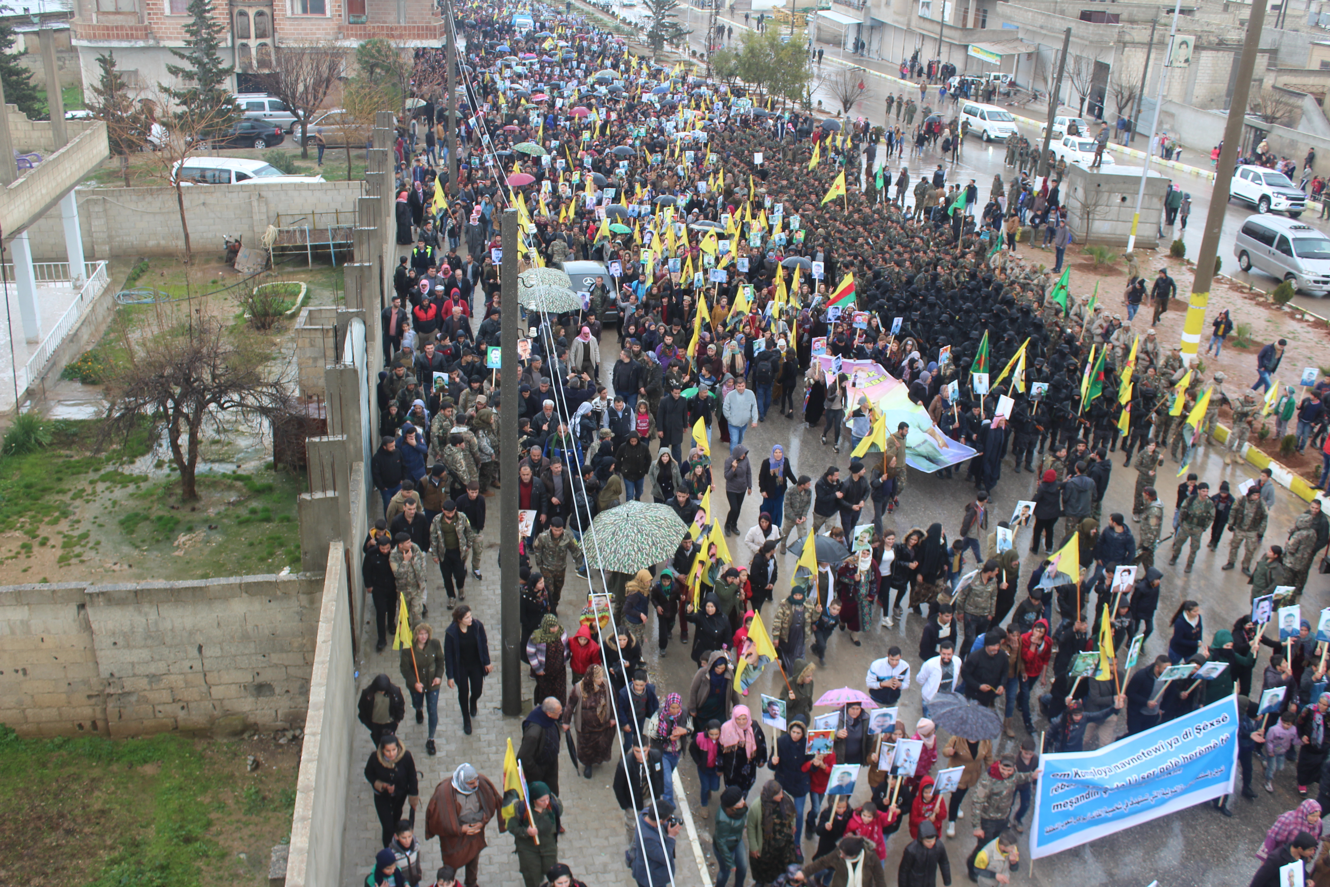 Bihezaran welatiyên ku li Kantona Rojava’yê Kurdistanê Kobanê hatin gel hev bi şiyara “Tecrîdê bişkîne, Faşîzmê têk bibe, Kurdistan azad bike” ve çalakiya meşê li dar xistin. Meş li ber Nexweşxaneya Kobanê destpêkir heya qada peykera Arîn Mîrkan berdewam kir. Gelek kes ji bajarên derdorê tevlî meşê bûn. Di meşê de diruşmên ” Bijî Serok Apo, Bimre Komploya Navnetewi, Bê Serok Jiyan Nabe!” berz kirin.