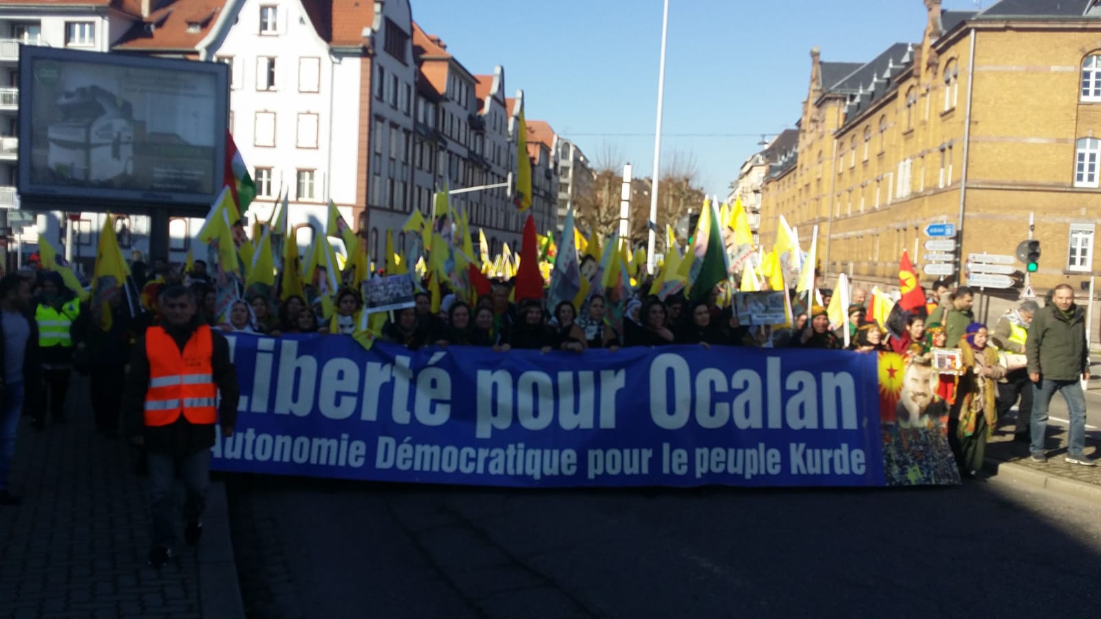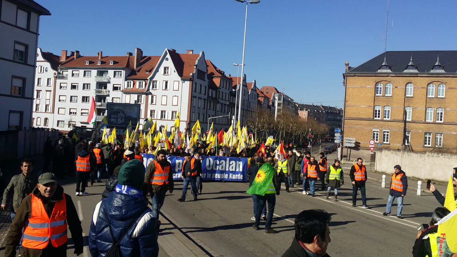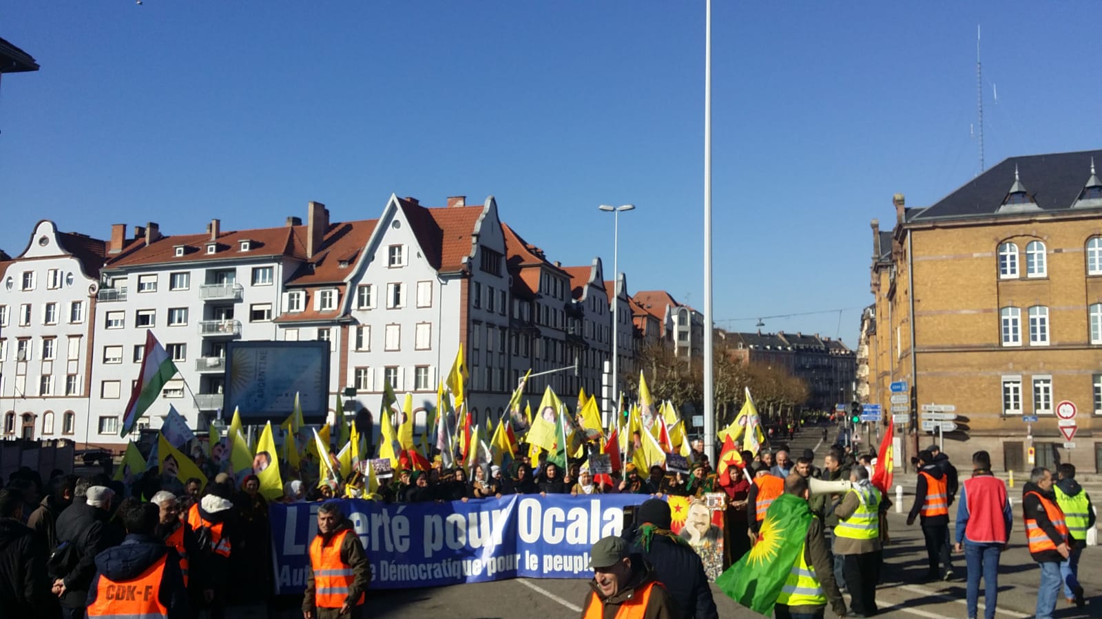 Kurd û dostên wan ên ku li Ewropayê dijîn ji bo protestokirina komploya navneteweyî ya 15’ê Sibatê û ji bo piştgiriya grevên birçîbûnê bi deh hezaran kes ber bi qada Rûe des Venneaûxê ya Strasboûrgê dimeşin.
