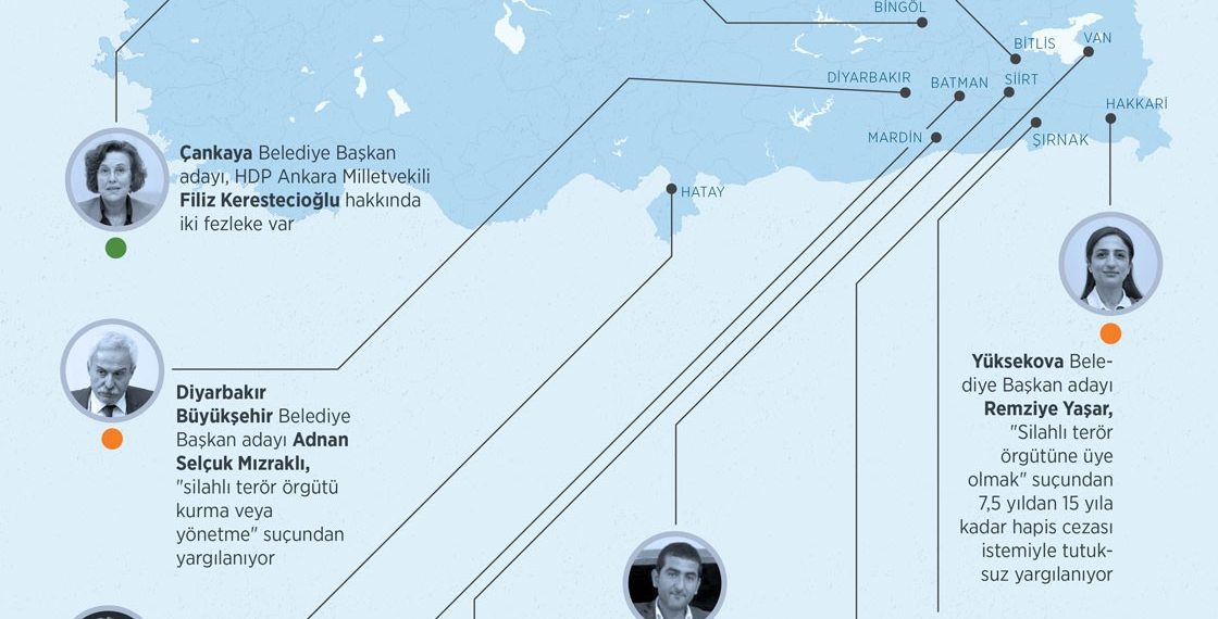 Namzetên ku di derheqên wan de lêpirsîn hatine destpêkirin bi grafîkekî nûçeya “HDP, di 31’ê Adarê di hilbijartinên herêmî de di gelek navçeyan de namzetên ku ji sucê terorê bûne dadgehî nîşan da” derbaskir. Di nav grafîkê de navên parlamenterên ku bûne namzetên HDP’ê Stenbol, Qers, Çewlîg û Enqere jî heye cih girt.