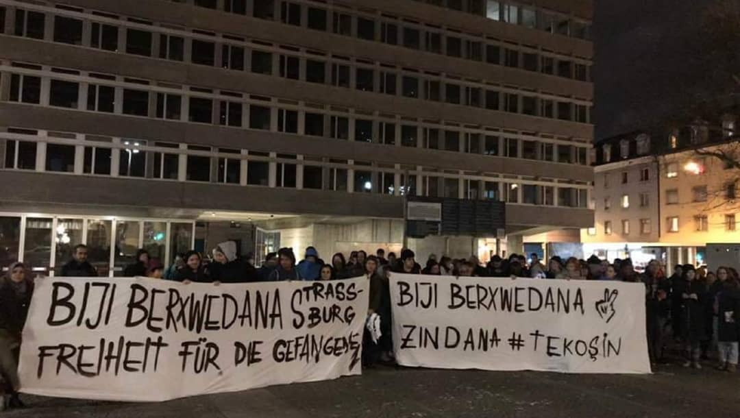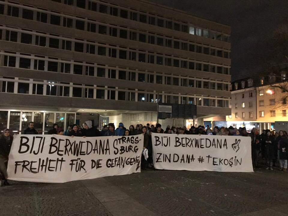 Şeva Şemiyê di çalakiyê de ya li Helvetîaplatzê pankartên bi nivîsa ”Bijî berxwedana zindanan”, ”Bijî berxwedana Strasboûrgê” û ”Ji berxwedêrên Strasboûrgê re azadî” hatin vekirin.