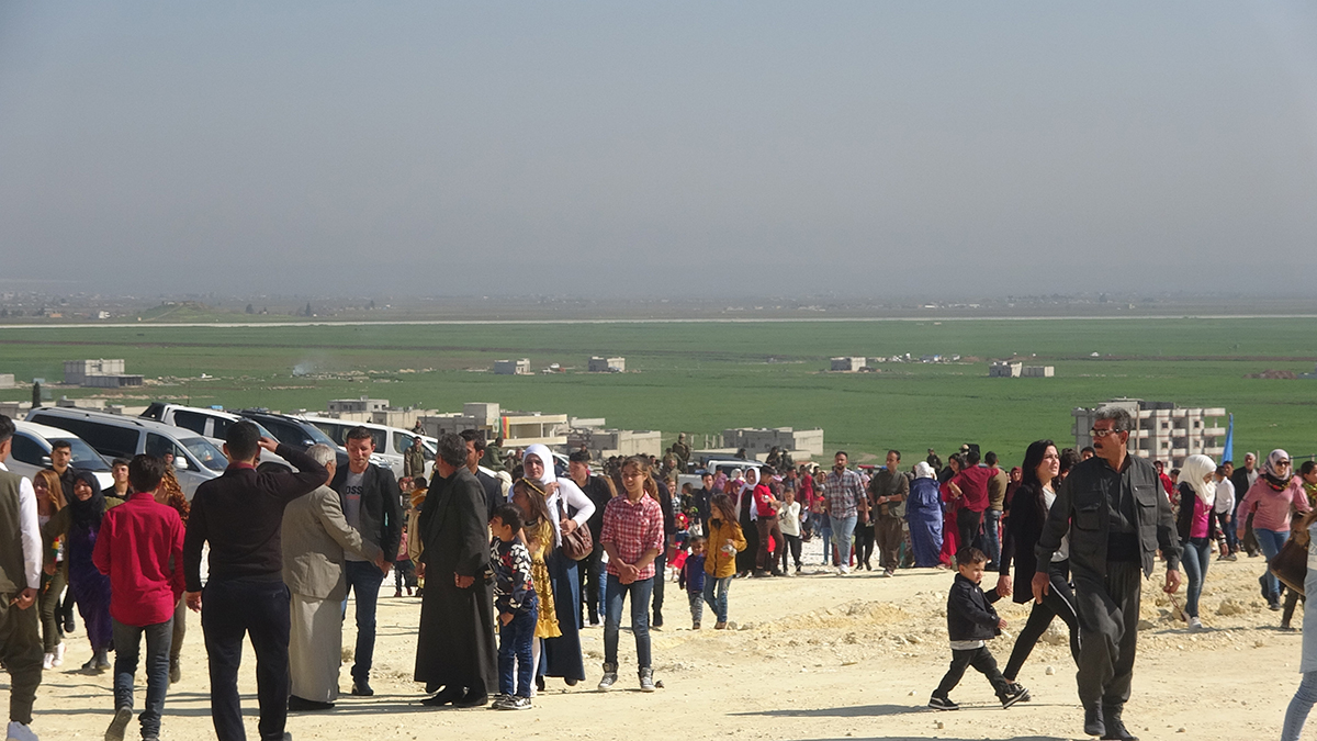 KOBANÊ – Li bajarê berxwedanê Gelê Kurd û gelên herêmê ji bo Newrozê pîroz bikin ber bi qada Newrozê ve meşiyan. Newroza Kobanê bi tevlîbûna deh hezeran welatî destpê kir. Gelê herêmê, jin û ciwan bi cilên xwe yên netewî beşdarî Newrozê bûn.