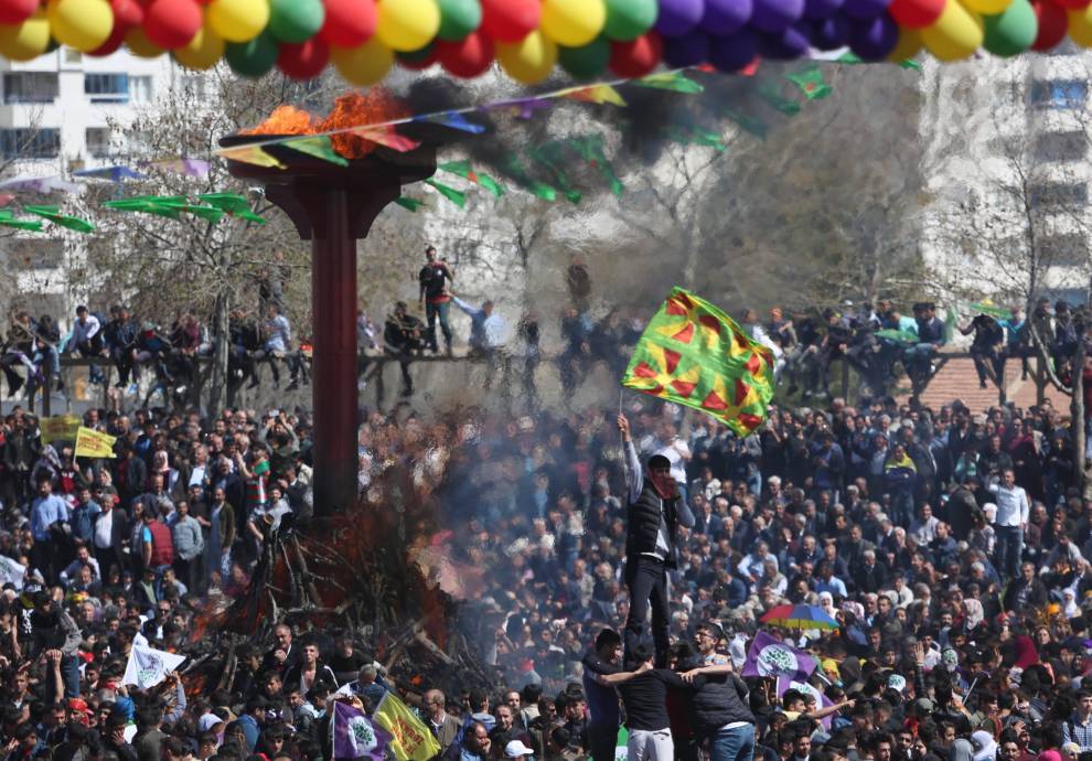 Bi deh hezaran welatiyên diherikin qadê dirûşmên “Bijî Newroz”, “Bijî berxwedana zîndanan”, “Leyla Guven rûmeta me ye”, “Bijî Serok Apo” û “Şehît namirin” berz dikin. Gel bi dirûşmên xwe dide diyarkirin ku dê tecrîdê bişkînin. Li qadê bi deh hezaran welatiyên kom dibin li ber stranan govend digerînin.