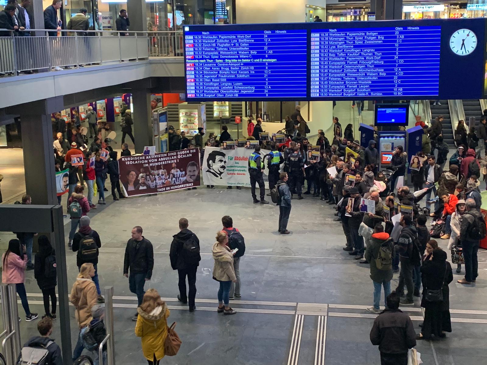 BERN – Li bajarê Bern ê Swîsreyê bi banga Tevgera Ciwanên Şoreşger û Platforma Piştevaniya bi Grevên Birçîbûnê re li Bahnofplatzê bi sedan kesên hatin ba hev, piştî çalakiya bêdeng û şûnde ber bi stasyona trenê ya navendê ve meşiyan. Di meşê de şehîdên li dijî tecrîdê çalakiyên canbexşane pêk anîn hatin bibîranîn.