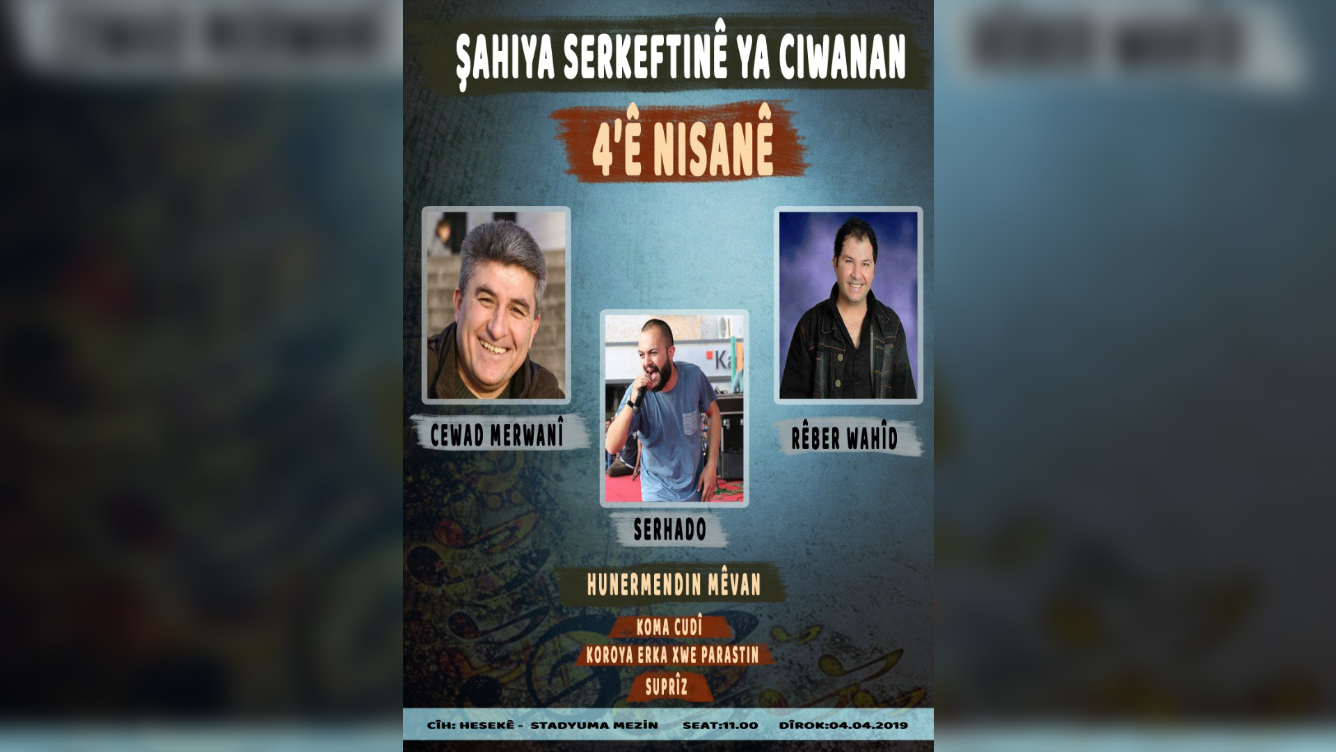 NAVENDA NÛÇEYAN – Di 4’ê Nîsanê wê li bajarê Hesekê li Stadyuma Mezin şahiya serkeftinê ya Ciwanan pêk were. Ciwanên ji Bakur û Rojhialtê Suriyê wê beşdarî vê şahiyê bibin. Şahiyê de wê hunermend Cewad Merwanî, Serhado, Rêber Wahîd, hunermendên mêvan Koma Cudî, Koroya Erka Xwe Parastinê û hunermendê Suprîz derkevin ser dikê.