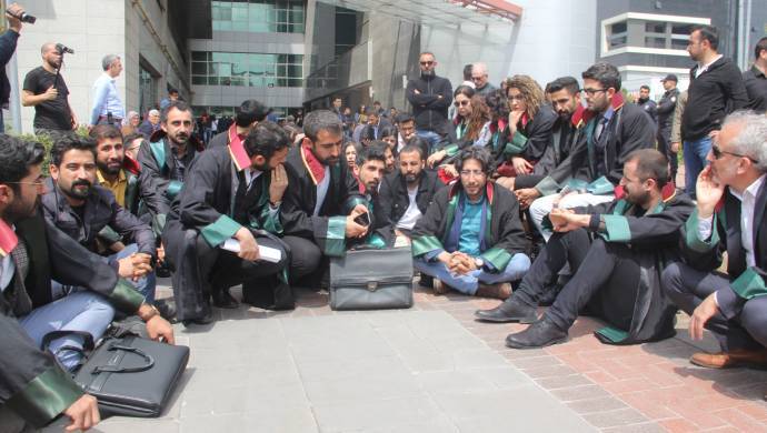 Li ser vê yekê parêzeran li baxçeyê dadgehê bi çalakiya rûniştinê rewşê protesto kirin. Parêzer Mehmet Altundaş di kêliya çalakiyê de axivî û bertek nîşanî helwesta polîsan da.