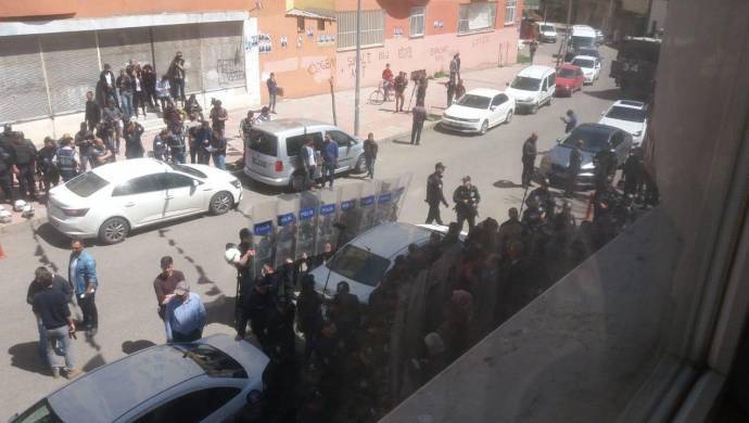 Xizmên girtiyan ê ku li pêşiya Girtîgeha Tîpa E’yê ya Amedê bûn, hatin ba avahiya HDP’ê. Polîsan dora xizmên girtiyan jî girtin.