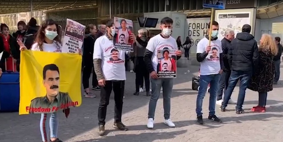 Ciwanan afîşên bi zimanê Fransî hildan û li dijî tecrîdkirina Rêberê Gelan Abdullah Ocalan sloganan qîriyan.