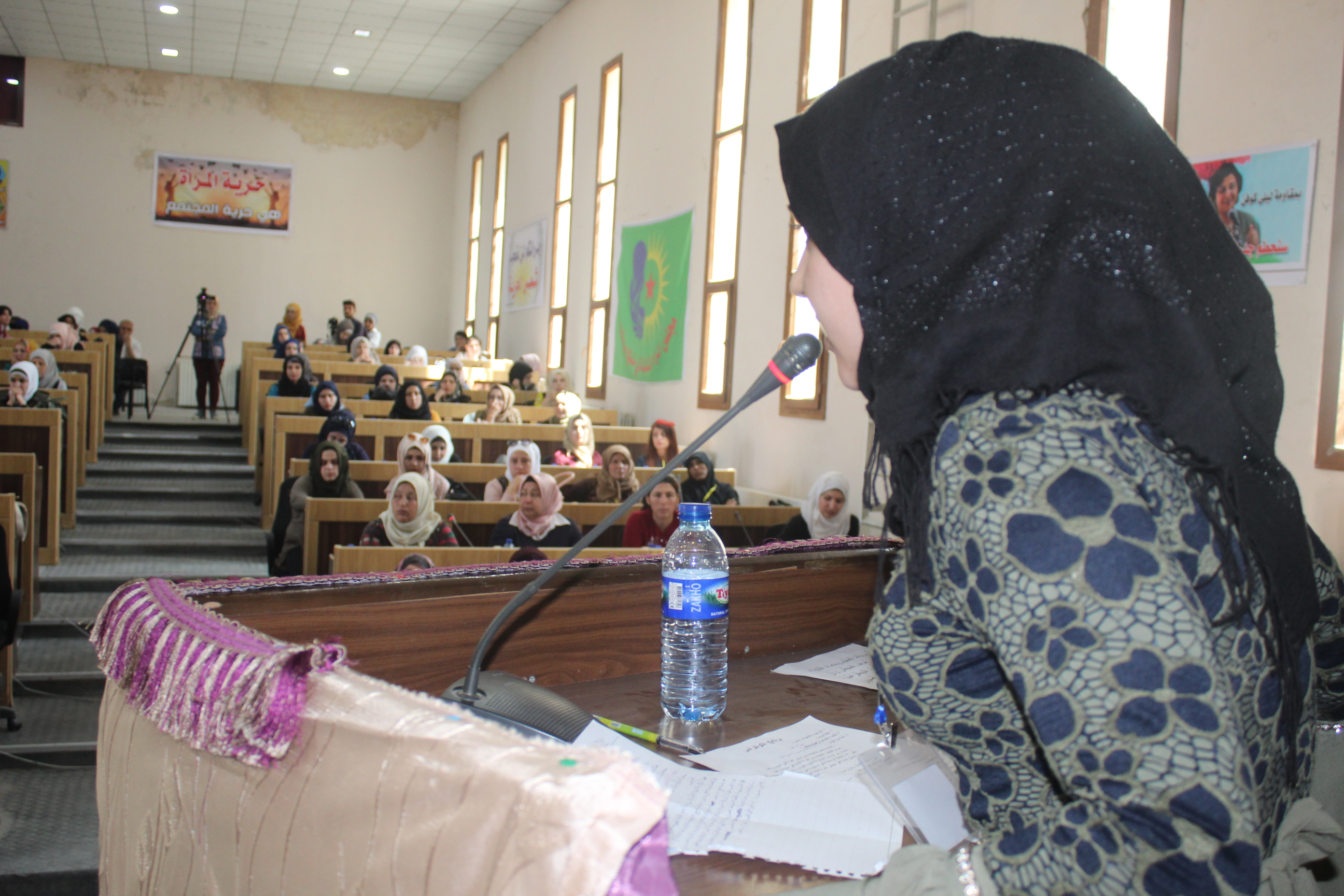 Konferans bi bîranîna cangoriyên azadiyê dest pê kir. Axaftina destpêkê ji aliyê Seroka Meclisa Rêveber a Meclisa Sûriyeya Demokratîk (MSD) Îlham Ehmed ve pêk hat. Îlham Ehmed lidarxistina konferansê li jinên ciwan ên Minbicê pîroz kir û got: ” Jinan di şerê li dijî DAIŞ‘ê heta ragihandina serkeftinê de roleke dîrokî lîstin. Heger pêngavên serkeftinê ji bo gelê Sûriyê girîng be, di heman demê de ji bo tevahî mirovahiyê jî girîng e. Ji ber tinekirina terorê xilaskirina mirovahî ji komkujiyan e.”