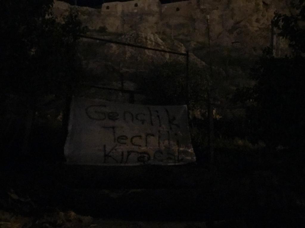 Înîsyatîfa Ciwanên Mêrdînê li herêma Mêrdîna kevn pankarta bi nivîsa “Ciwan wê tecrîdê bişkine” daliqandin.
