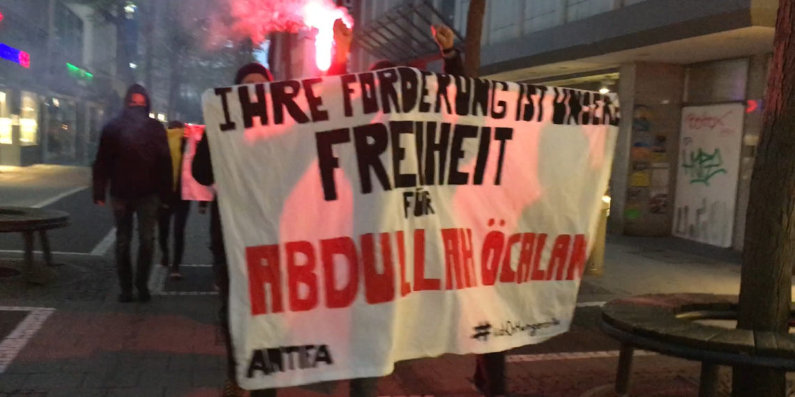Nêzî 20 ciwanên ku ji bajarên Darmstadt, Frankfûrt û Maînzê li hev civiyan tecrîda li ser Ocalan protesto kirin.