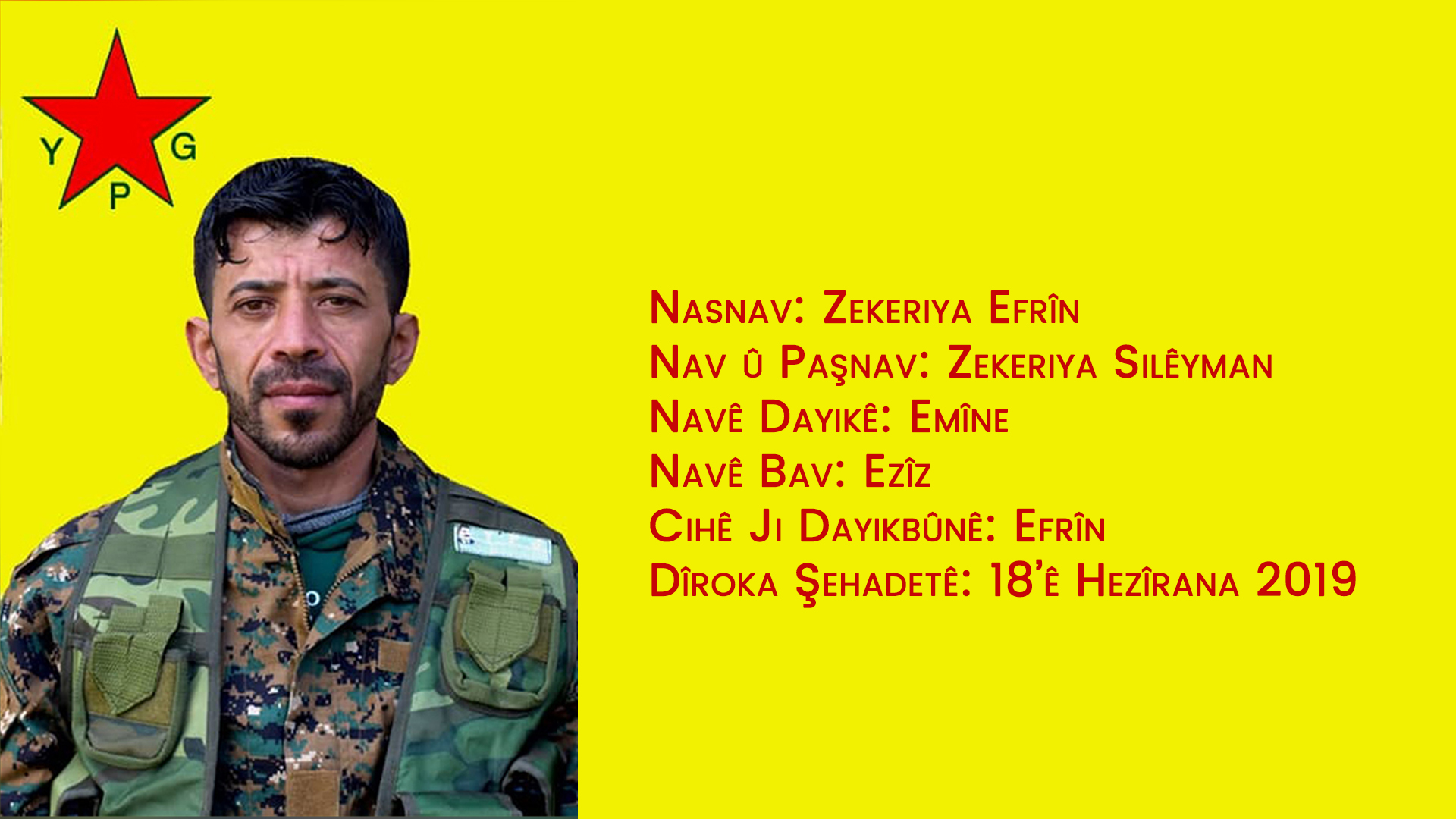 “Rêhevalê me Zekeriya Efrîn dema ku li ser erka xwe bû di roja 18’ê Pûşperê de di encama qrîza dil de şehîd ket.