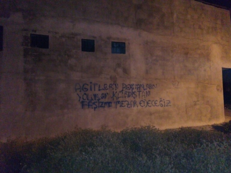 Yekîneya Tolhildana şehîd Zana Andok ji bo pêngava 15'ê Tebaxê li Edenê navçeya Seyhanê li kolana Gulbahçe dirûşmeyan li ser dîwaran nivîsandin.