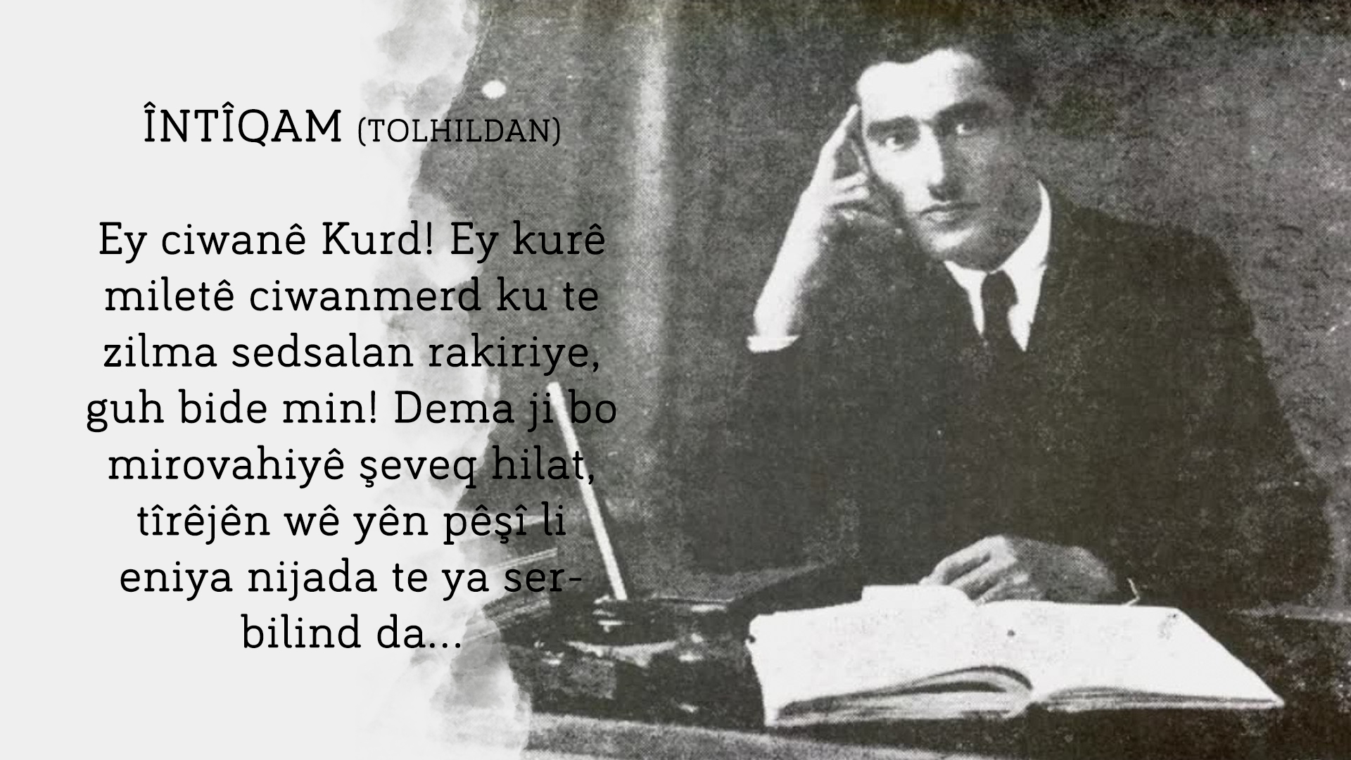 Ey ciwanê Kurd! Ey kurê miletê ciwanmerd ku te zilma sedsalan rakiriye, guh bide min! Dema ji bo mirovahiyê şeveq hilat, tîrêjên wê yên pêşî li eniya nijada te ya serbilind da. Ew nijada tu jê çêbûye, ji derya Hindê heta bi Qefqasan, ji keviyên rojhilat ên asya biçûk heta asya navîn li çiya û zozanên bilind ên bi tevik e. Dîroka te, dîrokeke domdar a destanên qehremaniyê ye. Ji ber ku ti zarokê miletekî ji çil salî zêdetire, ji bo hebûneke azad û bi namûs şer dike û îro jî ji vî şerî bêzar nebûye. Xwe nade paş, li ser me hemuyan deyne, em jiyana kurdan ya doh û îro ya bi firtofe û barozan bizanibin, çavkaniya êşên kişandinê û sedemên felaketên bi serê wan de hatine nas bikin û dek û dolabên dîrokê li serê wn gerandine bi jîrî hûrbikolin. Ji bo hebûna xwe biparêze û ji bo mayîna xwe bergiriyê bike, ti miletî bi qasî me nikarî bû demdirêj û domdar şer bike, di dîroka me ya dûrûdirêj de ti hêzê nikarîbû bikeftinê bi me bide qebûlkirin. Serê kurd, mîna çiyayên wî yên herî bilind her tim berz bû û li ber ti dagirkerî xwe xwar nekiriye.