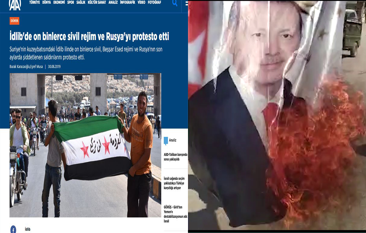 Xwepêşandên li Îdlibê ku heta derengiyê evarî didomiya Medya Şerê Taybet a dewleta tirk Anadolu Ajansı (AA) ket dewrê. Bi nûçeya sernivîsa “Li Îdlibê deh hezaran rejîma Sûriyê û Rusyayê protesto kirin” derewek mezin avêt holê. Xwepêşandên li Îdibê ku di esasê xwe de li dijî Erdogan bûn, ajansa tirk AA wek li dijî rejîma Sûriyê û Rusyayê nîşan da. Bi vê derewê ajansa Erdogan AA xwest rastiyê beravojî bike, lê li ser torên civakî gelek dimen û wêne derketin ku vê derewê vala derxist.