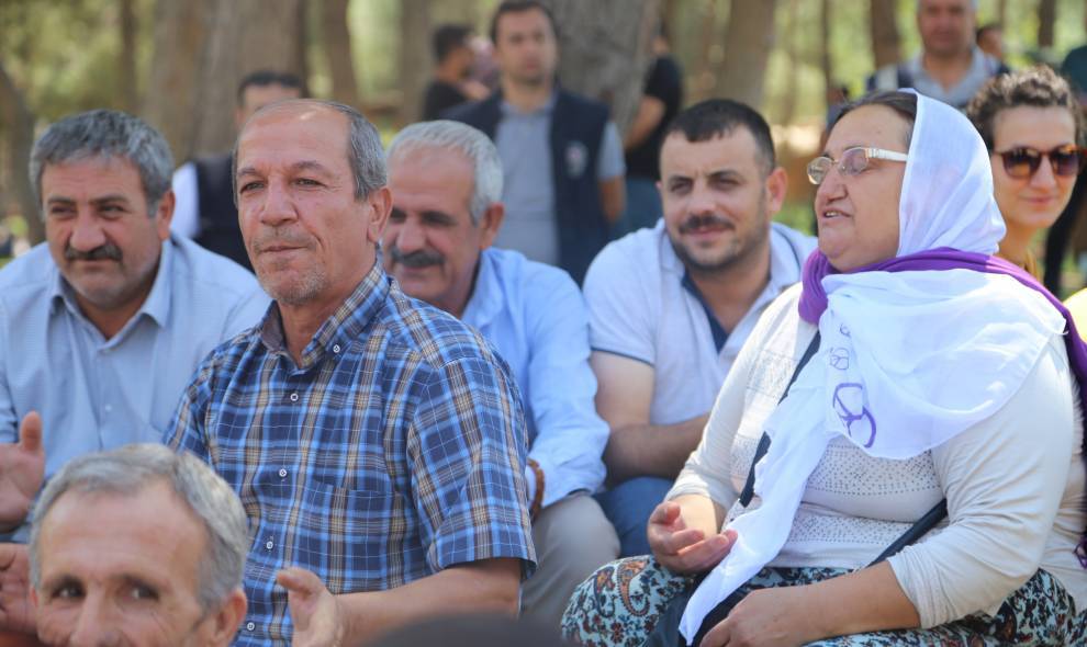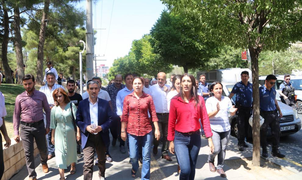 Koma HDP’ê piştî çalakiya rûniştinê bi dirûşmeyên “Em ê bi berxwedanê bi ser bikevin” û “Mêrdîn ya me ye” heta avahiya HDP’ê ya Mêrdînê meşiyan.”