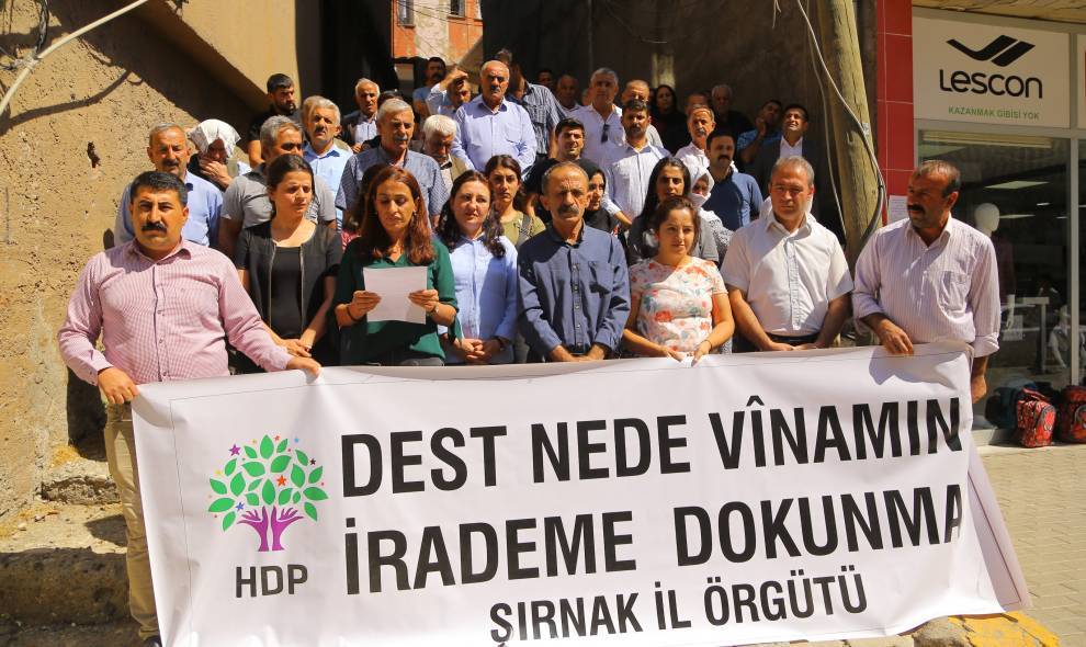 Rêxistina HDP’ê ya Şirnexê li ber avahiya xwe daxuyanî da û gelek kes beşdarî çalakiyê bûn. Welatiyan dirûşm berz kirin û nerazîbûna xwe anîn ziman. Hevseroka Rêxistina HDP’ê ya Şirnexê Zeynep Unat tayînkirina qeyûman wek “darbeya siyasî” nirxand û got: “Pergala hevserokatiyê kirine hedefa xwe. Ev pergal ji cîhanê re modelek nû ye û bûye referansa têkoşîna azadiya jinan. Em ê li dijî qeyûman li ber xwe bidin. Bêdengiya li dijî qeyûman erêkirina qeyûman e.”