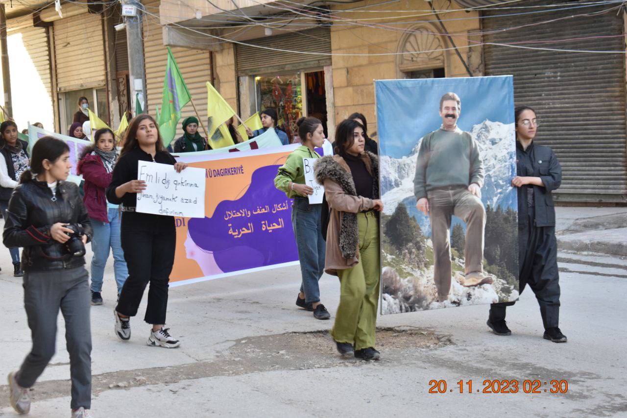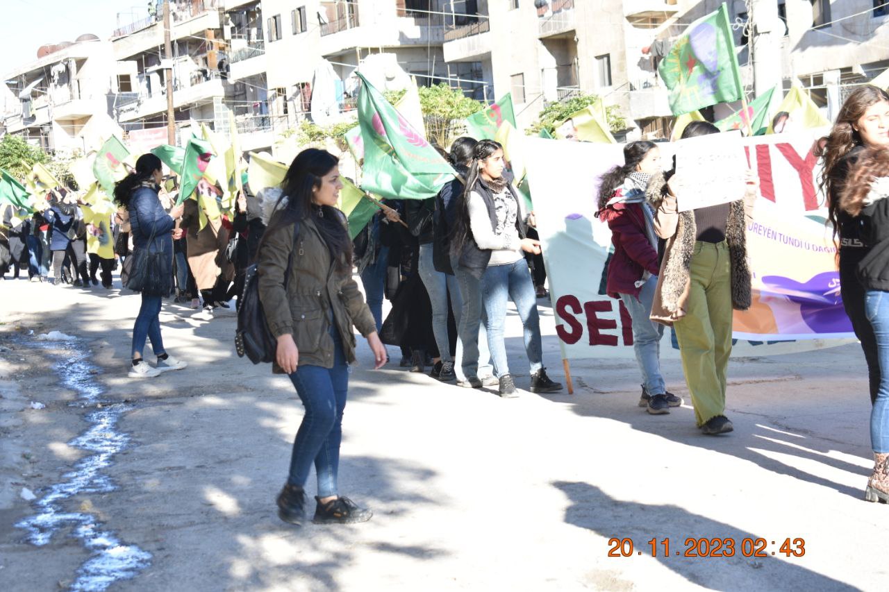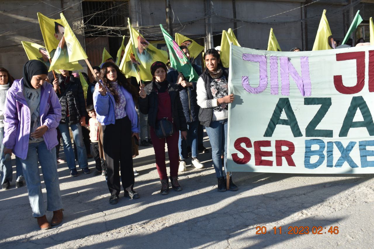 HELEB – Kadına yönelik şiddetle mücadele günü olan 25 Kasım’a ithafen bugün Halep kentinde toplu yürüyüş düzenlendi. Ademo bölgesinden başlayan yürüyüş Cebene’ye kadar devam etti. Yürüyüşe yüzlerce genç kadın ve Halep halkı katıldı. Yürüyüş boyunca Kadınlar Jin Jiyan Azadî, Bijî Serok Apo, sloganları atıldı.
