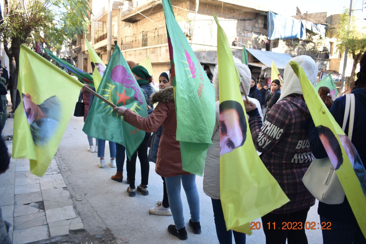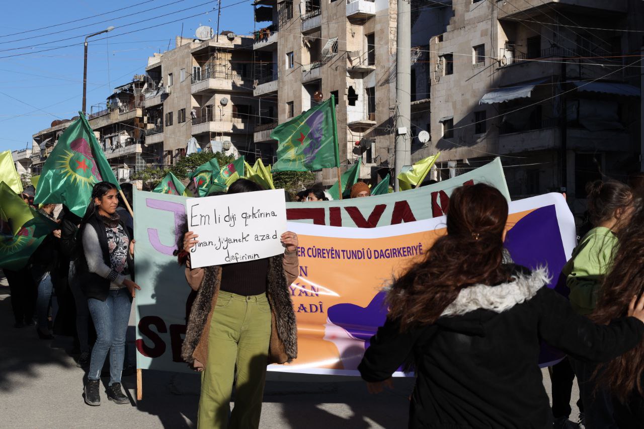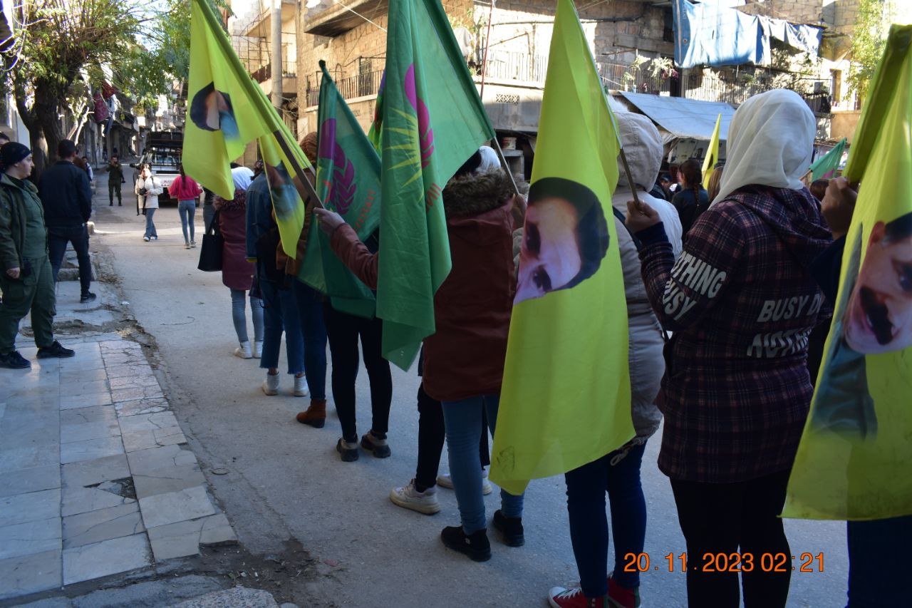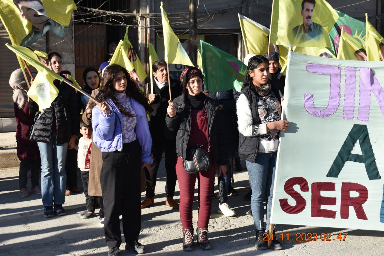 HELEB – Kadına yönelik şiddetle mücadele günü olan 25 Kasım’a ithafen bugün Halep kentinde toplu yürüyüş düzenlendi. Ademo bölgesinden başlayan yürüyüş Cebene’ye kadar devam etti. Yürüyüşe yüzlerce genç kadın ve Halep halkı katıldı. Yürüyüş boyunca Kadınlar Jin Jiyan Azadî, Bijî Serok Apo, sloganları atıldı.