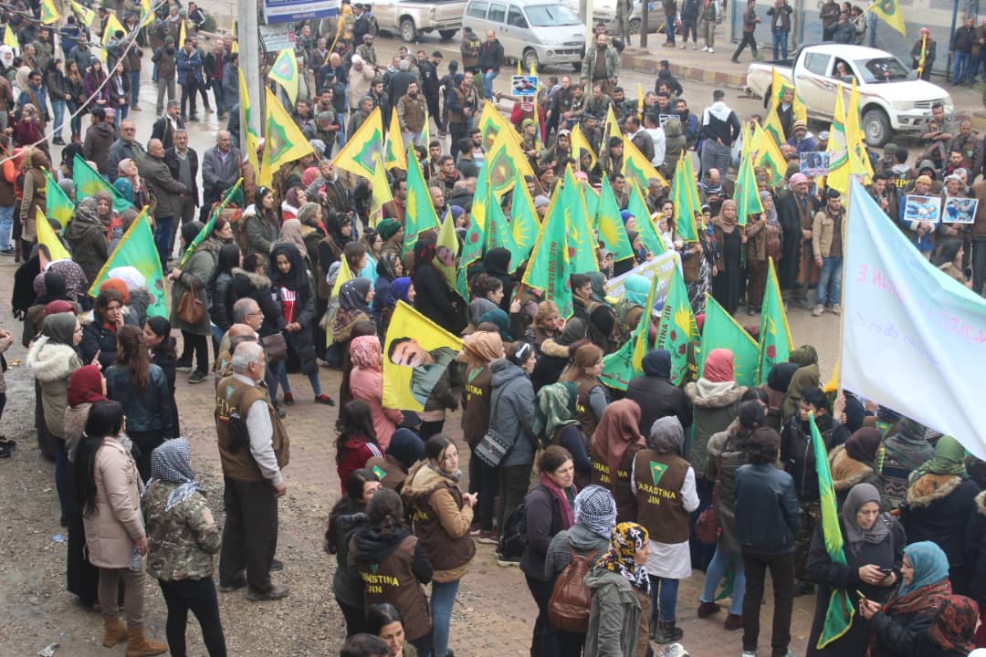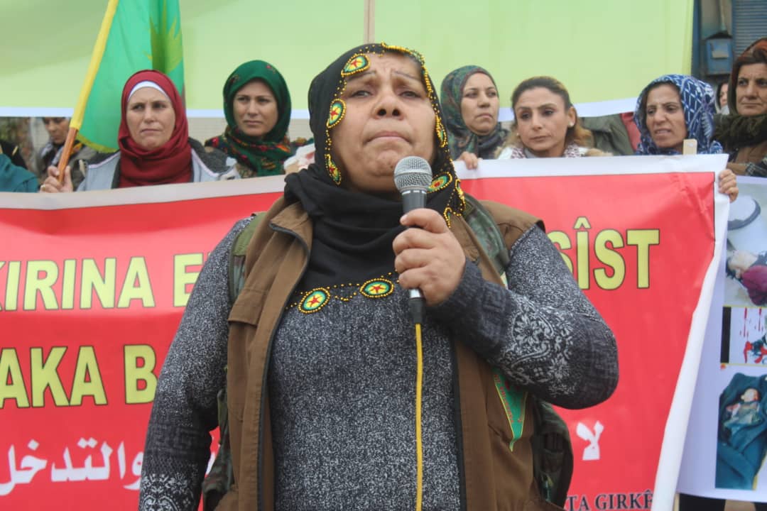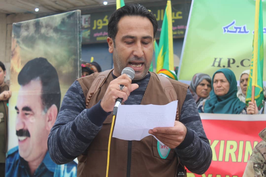 İlçe merkezinde bulunan El-Selam Kent Hastanesi önünde mitinge dönüşen yürüyüşte Qamişlo HPC yönetimleri Qamişlo Hediya Abdullah ve  Xelef Hisên tarafından bir dizi konuşmalar yapıldı. Yapılan konuşmalarda, Kuzey ve Doğu Suriye’ya yapılan saldırıların Önder Öcalan’a karşı yapılan Uluslararası komplonun devamı olduğu kaydedildi.