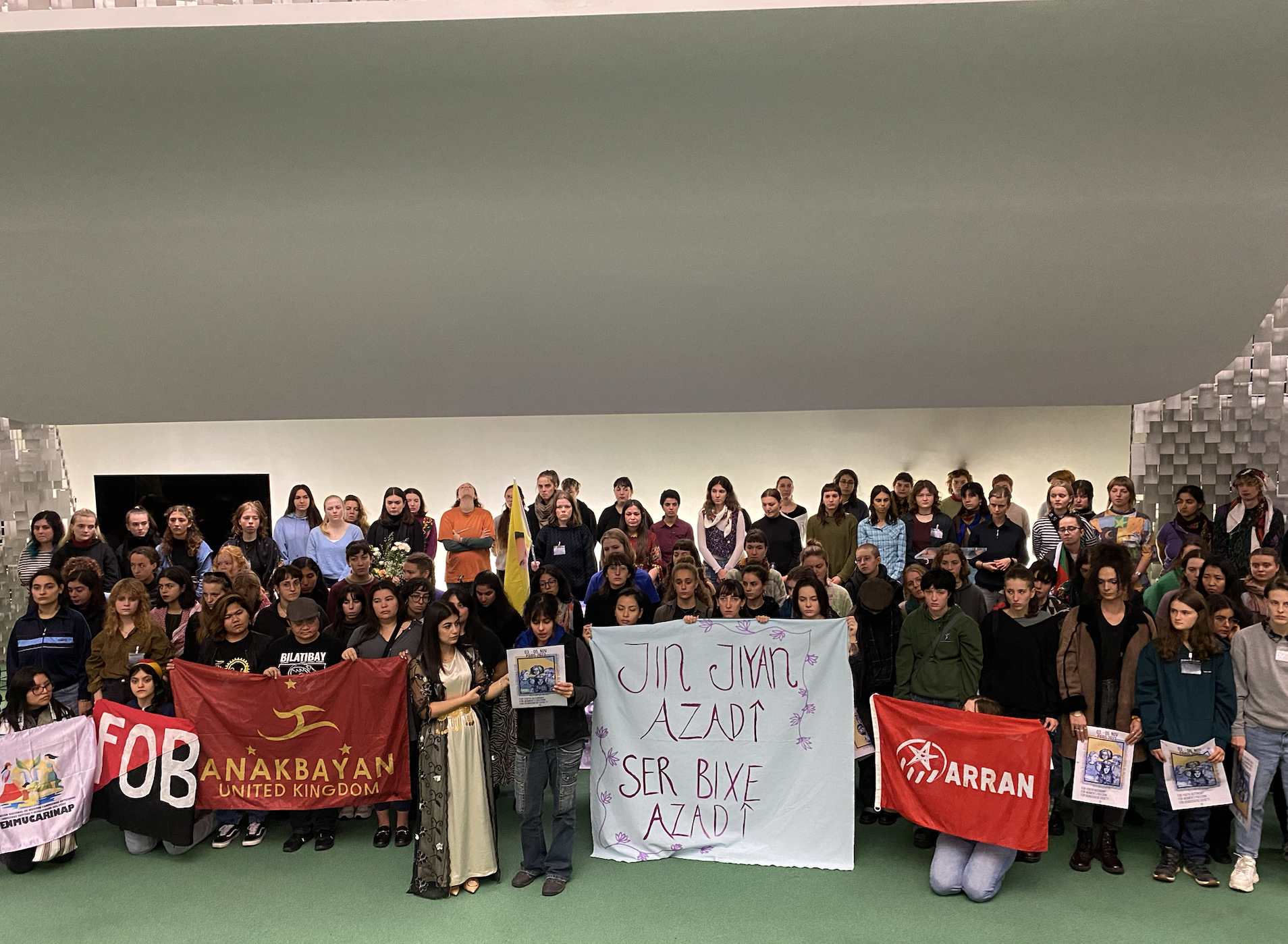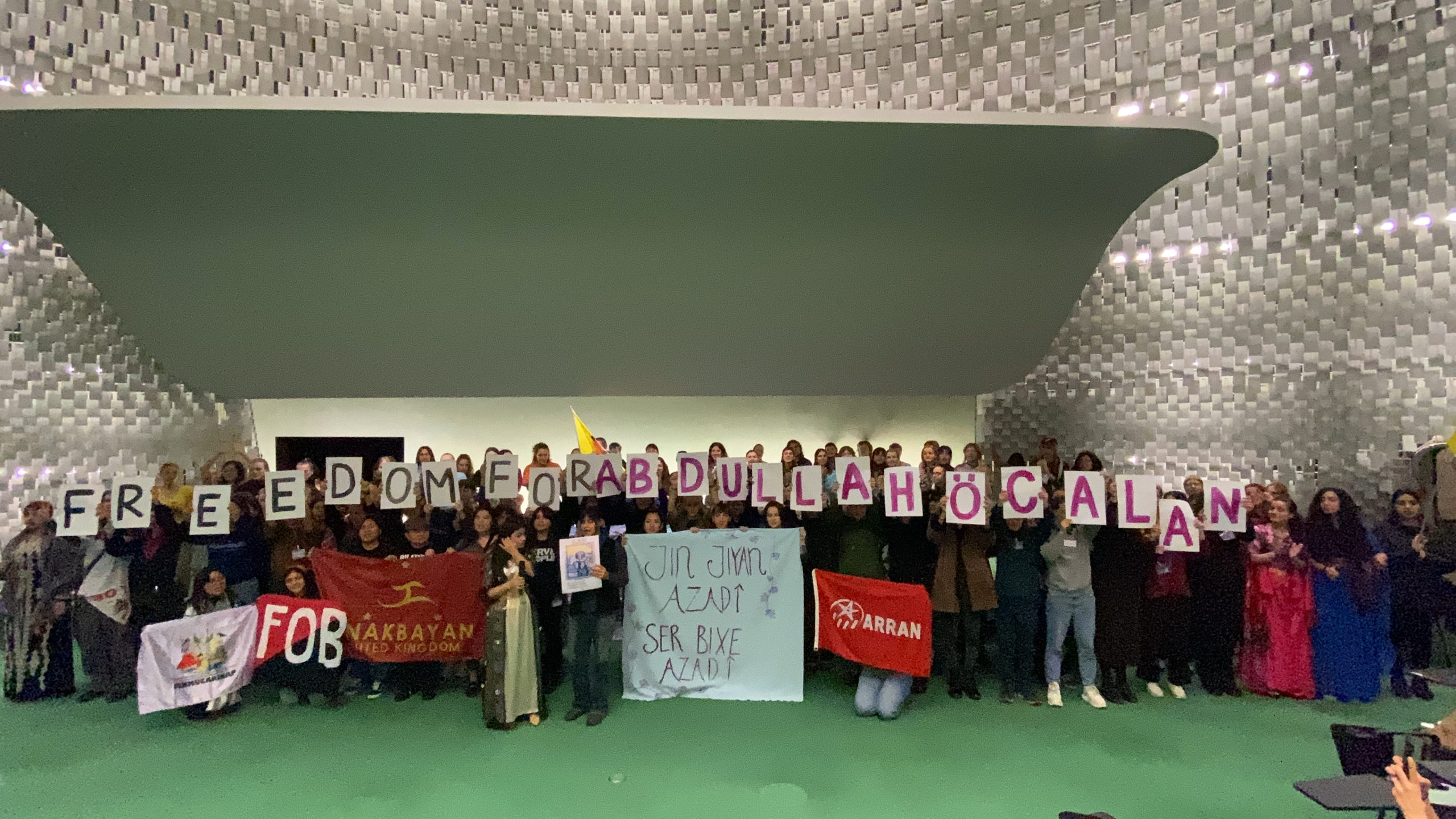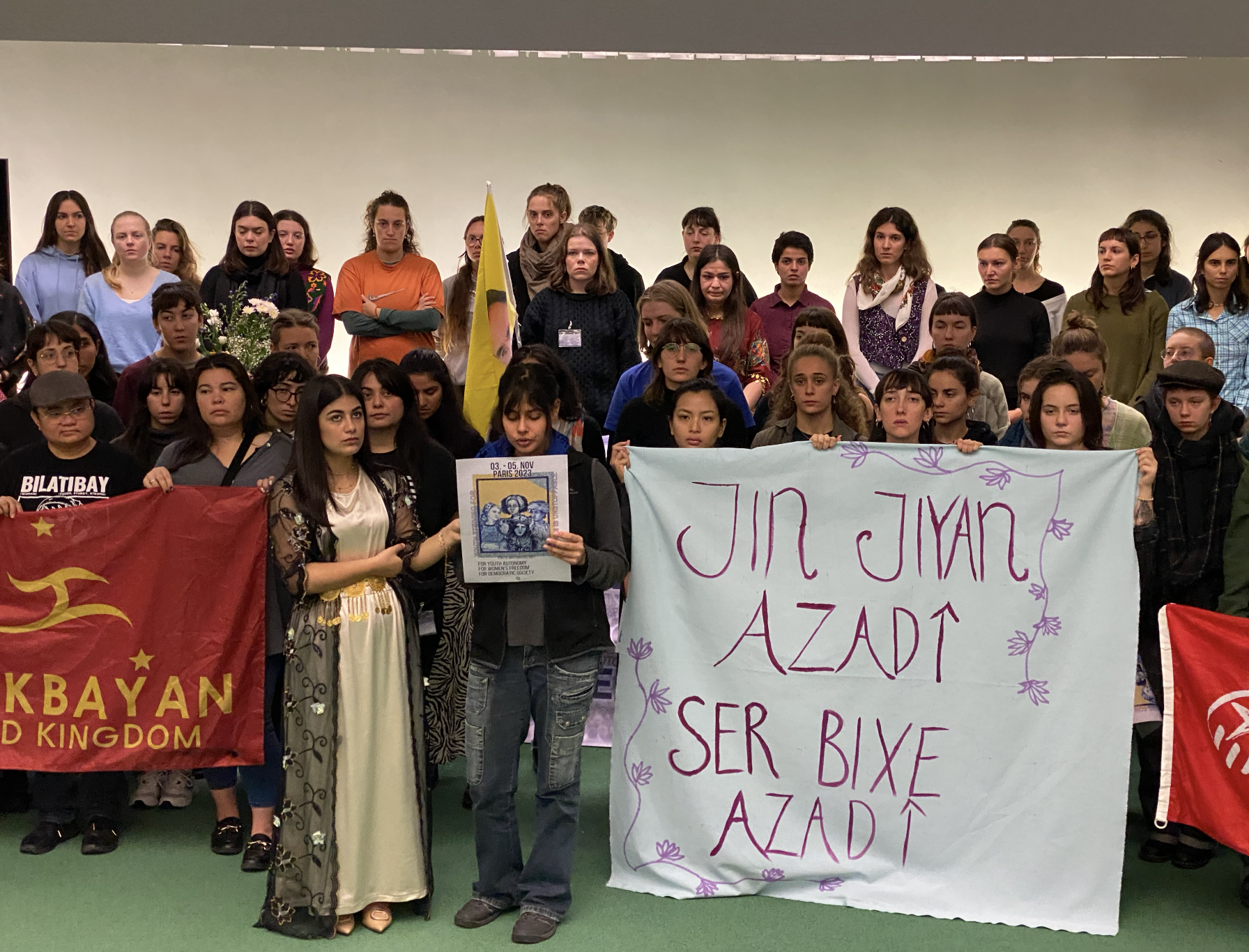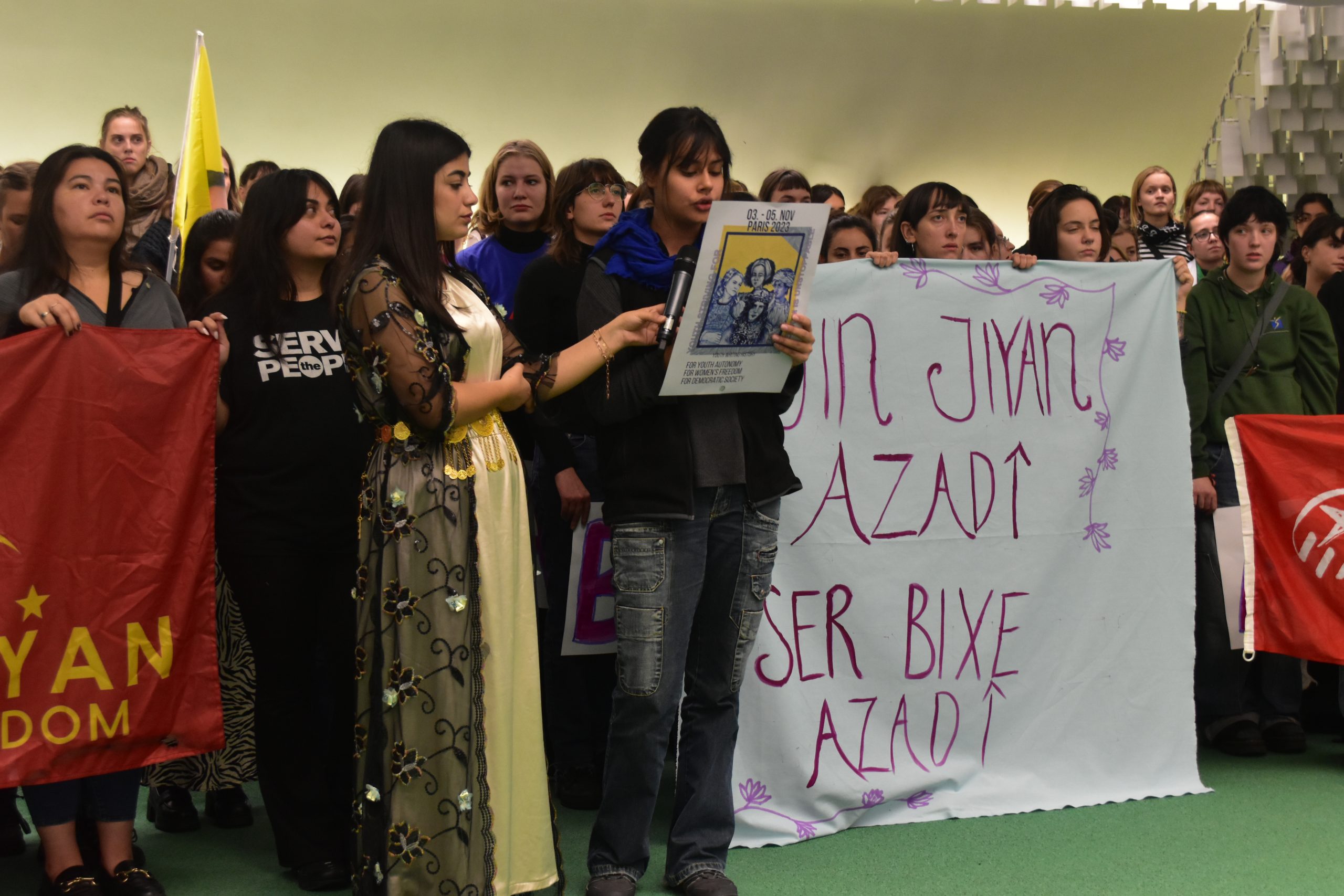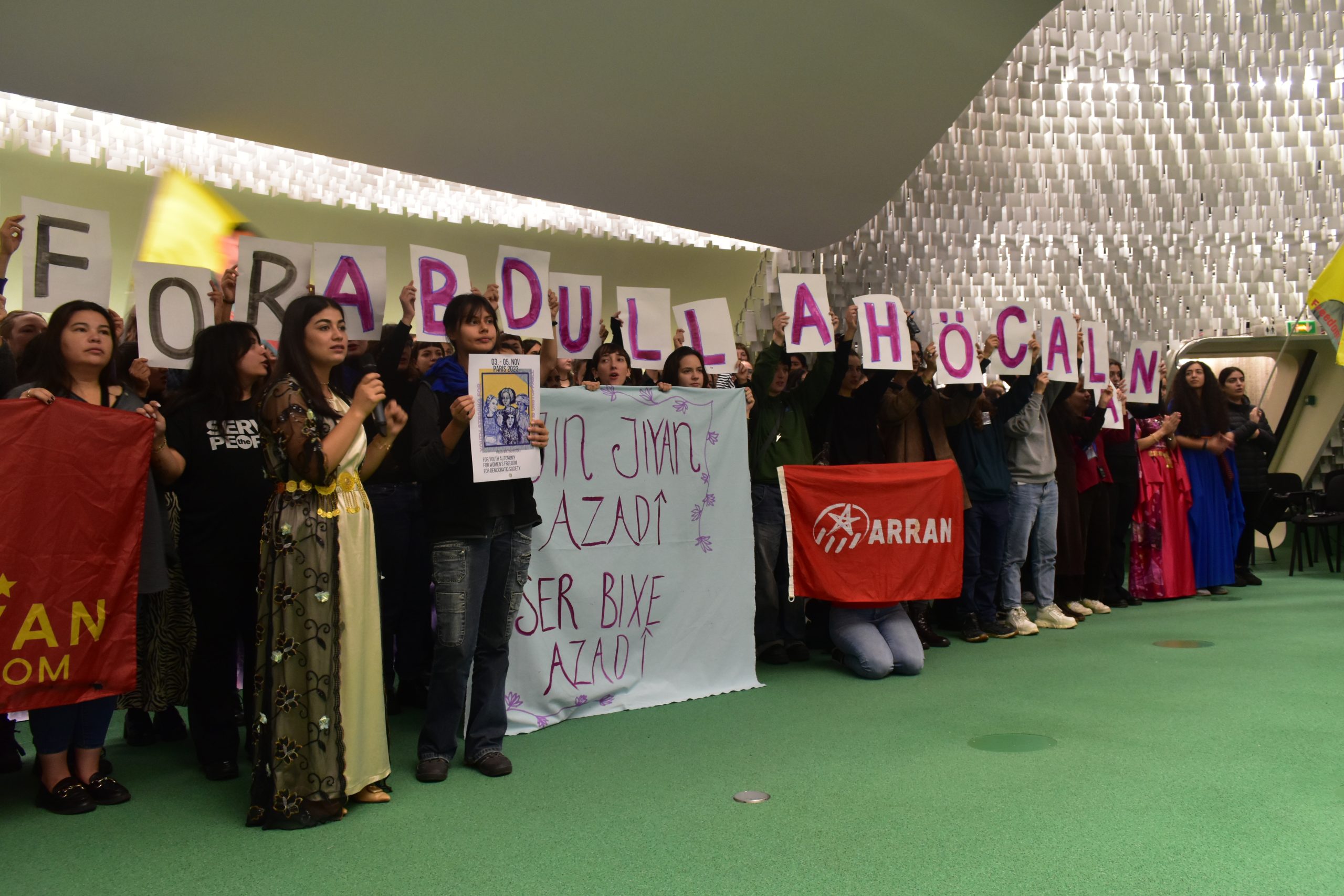 Bugün, dünyanın dört bir yanından gelen genç kadınlar olarak ilk Dünya Gençlik Konferansı’nda bir araya geldik. Burada, Kürt Özgürlük Hareketi’nin lideri Abdullah Öcalan’ın fiziki özgürlüğü için duruyoruz. Dünyada özgürlük ve barış arayışı içindeyiz. Kapitalizm ve baskılardan arınmış bir dünya için mücadele ediyoruz.