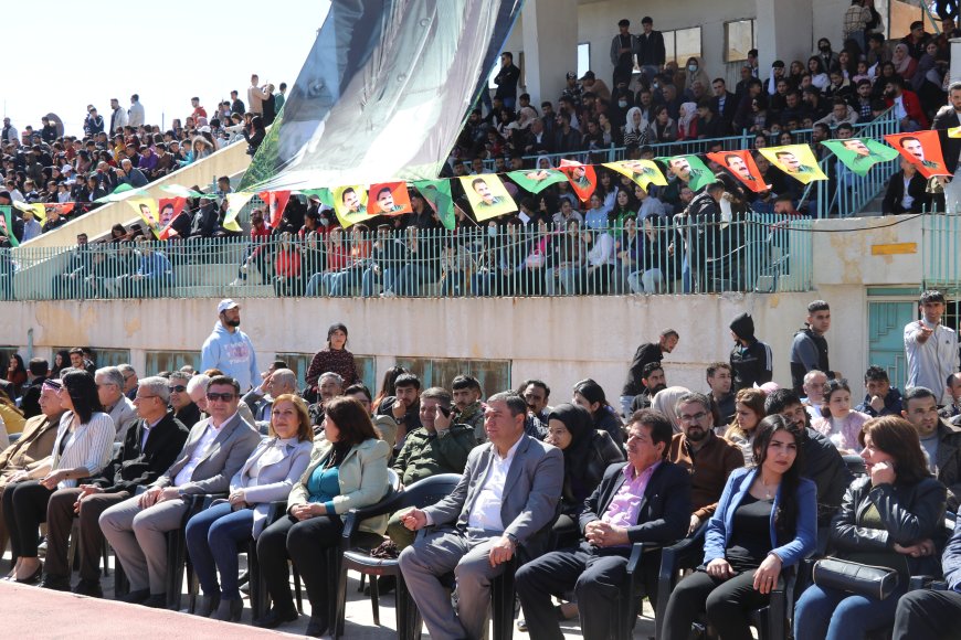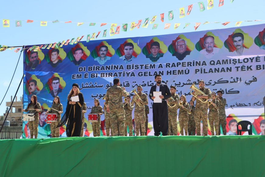 QAMIŞLO- Cizîr Kantonu Demokratik Özerk Yönetimi, 12 Mart 2004 Serhıldanı’nın 20’nci yıl dönümünde, “Qamişlo Serhıldanı’nın 20. yıl dönümünde, halkların birliği ve kardeşliğiyle tüm komploları yeneceğiz” sloganıyla Qamişlo’daki 12 Mart Şehitleri Stadı’nda Serhıldan Şehitleri için anma töreni düzenledi.