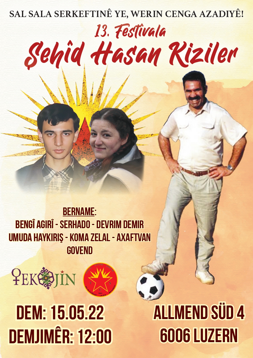 TCŞ ve TekoJIN öncülüğünde İsviçre’de gerçekleşecek olan 13. Hasan Kızıler Festivali “Sal Sal Serkeftinê ye, Werin Cenga Azadîye” şiarıyla startını verdi. 13. Şehit Hasan Kızıler Festivali, bu yıl Şehit Berjîn Zenda şahsında tüm şehitlere adanacaktır. Her ne kadar direniş kalesi olan Kürdistan’dan uzak olsakta tüm ölümsüz kahramanların, Önder APO’nun ve özgürlük gerillalarının direniş ruhunun aramızda olduğu bir gerçekliktir.