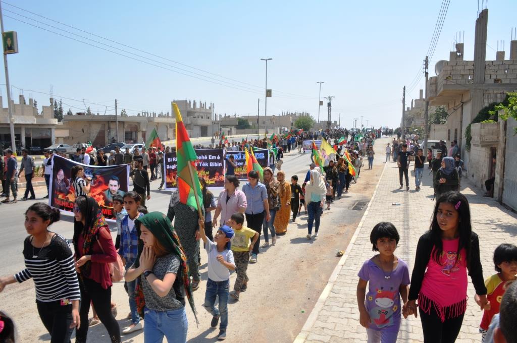 KOBANÊ – Kobanê’de Rojava Gençlik Birliği (YCR) ve Genç Kadın Birliği (YJC) tarafından organize edilen gençlik yürüyüşü ile 14 Temmuz 1982 ‘Büyük Ölüm Orucu’ eyleminde şehit düşenler anıldı. Şehit Sariya Özgür Caddesi’nde bir araya gelen binlerce genç, Fırat bölgesinden gençlerin de katılımıyla yürüyüşe geçti. YCR, YJC, PYD bayrakları ve üzerinde “Türk devleti işgalciliğine karşı başkaldır, savaş, Efrîn’i özgürleştir” ve “Bijî Serok Apo” yazılı pankartlar ile Özgür Kadın Meydanı’nda doğru yürüyüşe geçildi.