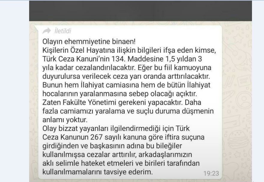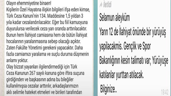 Bir diğer mesaj ise şu şekilde: “Selamun Aleyküm. Yarın saat 12.00’da İlahiyat Fakültesi önünde bir yürüyüş yapılacakmış. Gençlik ve Spor Bakanlığı’nın kesin talimatı var. Yürüyüşe katılanlar yurttan atılacaktır. Bilginize”
