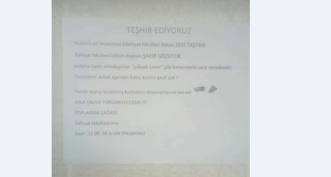 WAN– Son dönemlerde tacizle gündeme gelen Yüzüncü Yıl Üniversitesi’nde teşhir etmeler arttıkça üniversitenin telaşı da artıyor. Bugün bir grup tarafından teşhir etmek ve tacize karşı yapılacak olan toplanma çağrılarına dair üniversite koridorları ve sınıflara bildiri asıldı. Bildiri şu şekilde: