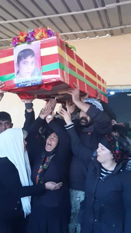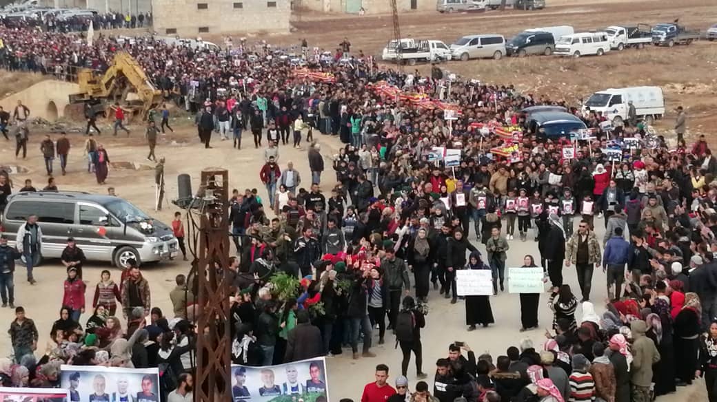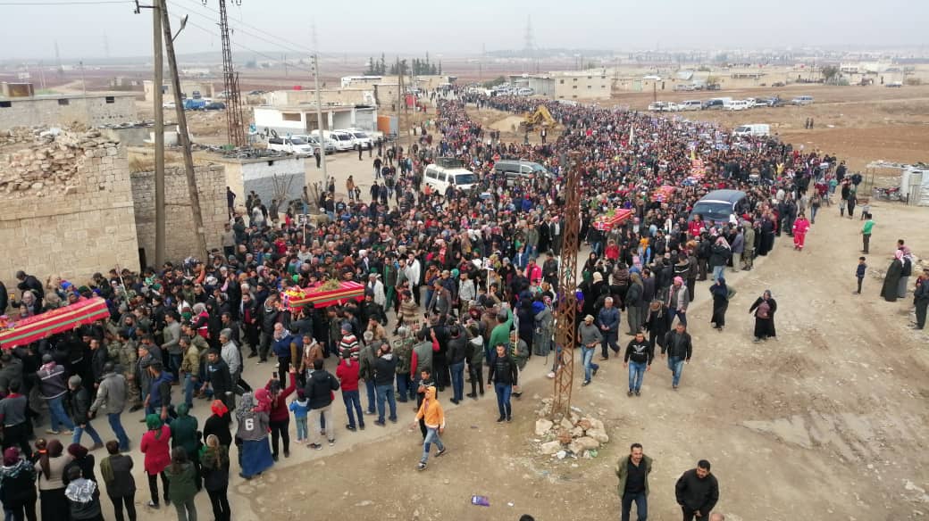 TİL RİFAT- İşgalci Türk devleti ve çetelerinin 2 Aralık Pazartesi günü Şehba’ya bağlı Til Rifat ilçesinde okul bahçesini bombardımana tutarak 8’i çocuk 10 kişiyi katletmişti. Bugün Şehba’ya bağlı Fafin İlçesinde bulunan yüzlerce yurttaş, şehitlerin resimleri eşliğinde katliam şehitleri son yolculuklarına uğurlanacak.