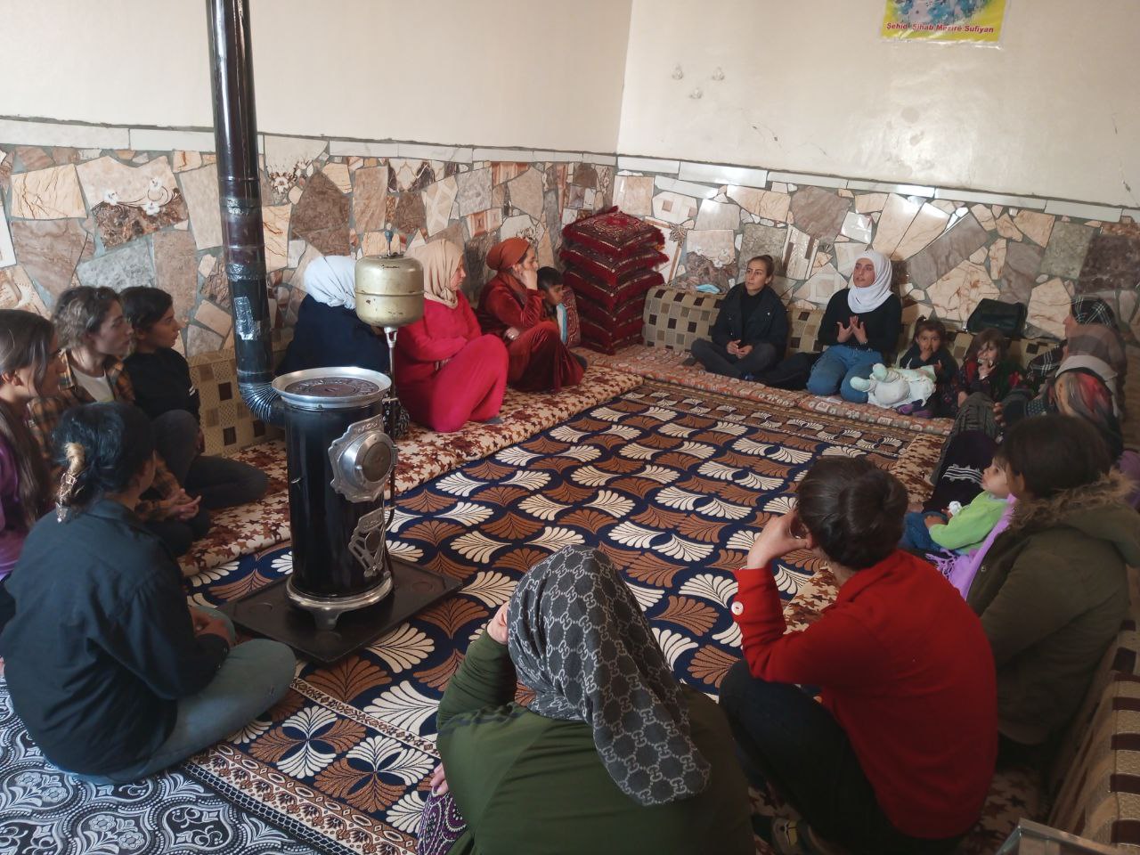 KOBANÊ- Uluslararası Kadına Yönelik Şiddetle Mücadele Günü’nün yaklaşması nedeniyle Kobanê Yekitiya Jinên Ciwan (Genç Kadın Birliği)” Jin Jiyan Azadî Serbixe Azadî sloganıyla kısa bir zaman önce faaliyetlerine başlamıştı. Faaliyetler kapsamında Yekitiya Jinên Ciwan Kobanê köyleri olan Mezra Sofya köyü, Til Khazal köyü ve Taşlog köyünde köyde kadına yönelik şiddetle ilgili toplantı yapıldı. Toplanıtda Yekitiya Jinên Ciwan adına Dilan Mahmut tarafından genç kadınlara ve kadınlara seminer verdi. Seminer tüm devrim şehitlerinin anısına bir dakikalık saygı duruşuyla başladı. Seminerde soykırım ve kadına yönelik şiddet konuları, kadınların örgütlenmesi, dayanışması ve birliğinin önemi tartışıldı.