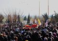 HABER MERKEZİ- Kuzey Doğu Suriye’nin Hesekê kentinde yüzlerce kişi, Şam hükümetine bağlı çetelerin Dêrazor doğusuna yönelik gerçekleştirdiği saldırıda şehit düşen Udey El Îbrahîm ve Miwefeq Xilêf ile DAİŞ çetelerinin Hesekê kentinde gerçekleştirdiği saldırıda şehadete ulaşan Silêman Silêman ve Essaf El Hesîno’yu kentin Dawûdiye köyündeki Şehit Dijwar Şehitliği’nde toprağa verdi.