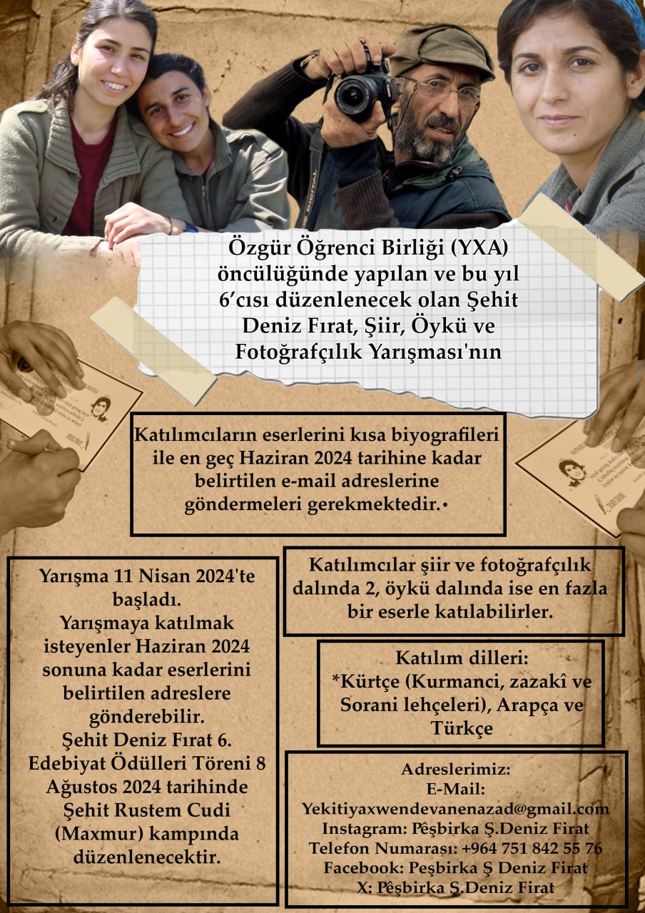 Özgür Öğrenci Birliği (YXA) öncülüğünde yapılan ve bu yıl 6’cısı düzenlenecek olan Şehit Deniz Fırat, Şiir, Öykü ve Fotoğrafçılık Yarışması'nın başvuruları başladı.