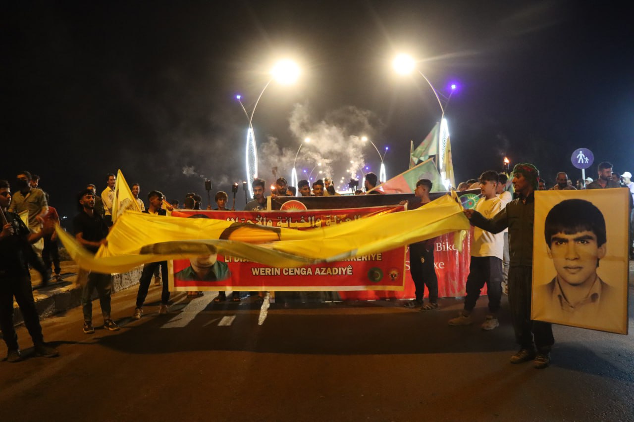 REQA- Reqa kenti Suriye Devrimci Gençlik Hareketi, Önder APO’ya yönelik uluslararası komployu kınama eylemleri kapsamında, “Güneşimizi karartamazsınız” sloganıyla meşaleli yürüyüş düzenledi.