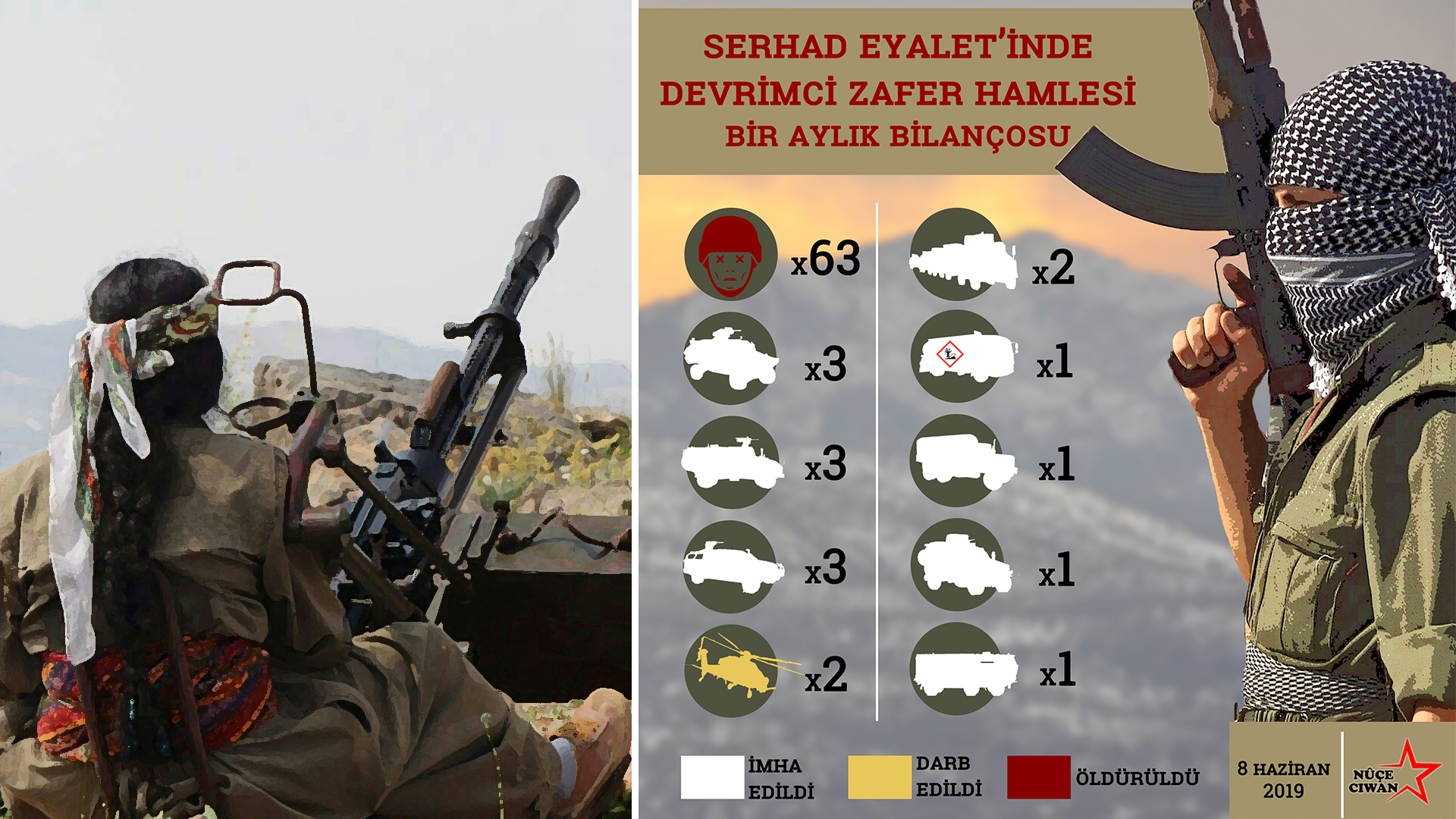 Kürdistan Özgürük Gerillaları Mayıs ayı’ndan bu yana Devrimci Zafer Hamlesi çerçevesinde düzenlediği eylemlerde birçoğu üst rütbeli 63 işgalci Türk askeri ve 6 kontra öldürüldü.
