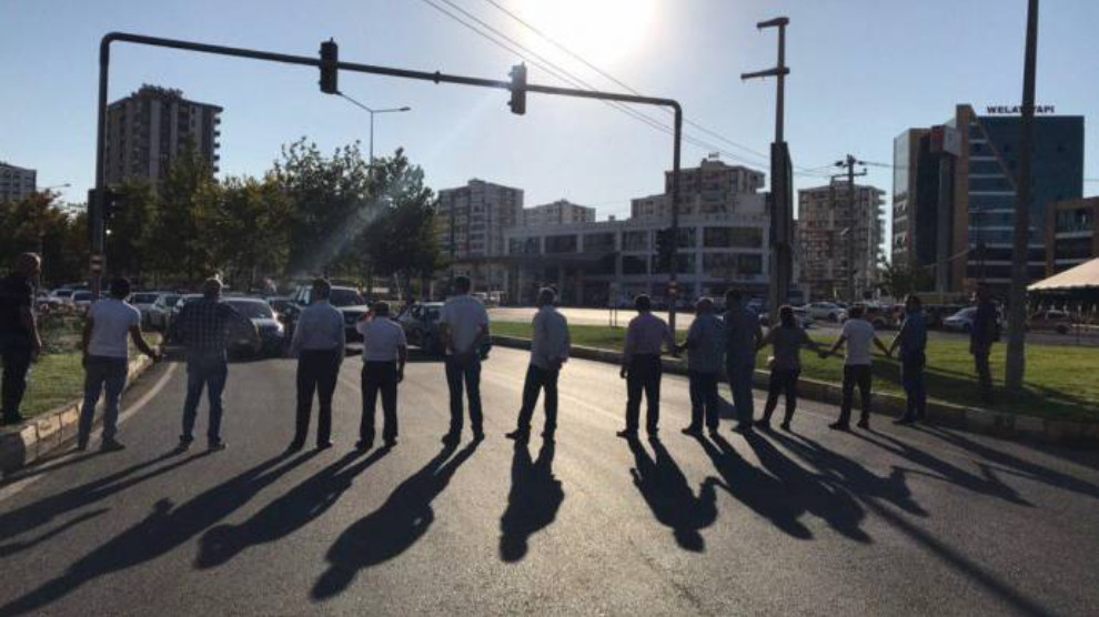 AMED – HDP’li Amed, Wan ve Mêrdîn büyükşehir belediyesine kayyum atanmasını protesto eden yurttaşlar Amed merkez Kayapınar ilçesi Dünya Kavşağı’nda insan zinciri oluşturarak yolu trafiğe kapattı.