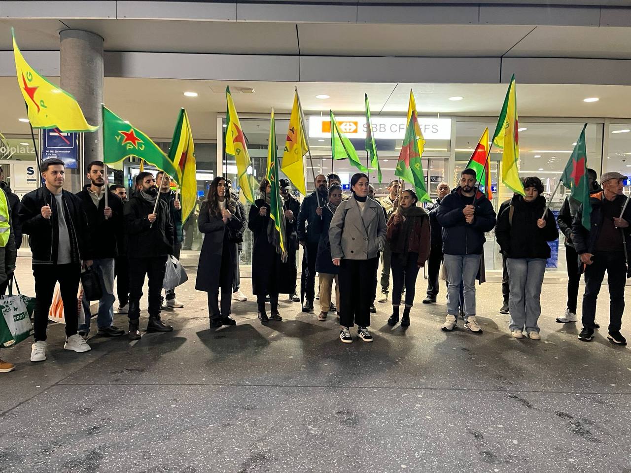 Gençlerin öncülüğünde Aarau Tren İstasyonu önünde bir araya gelen Kürdistanlılar eyleme bir dakikalık saygı duruşuyla başladı.