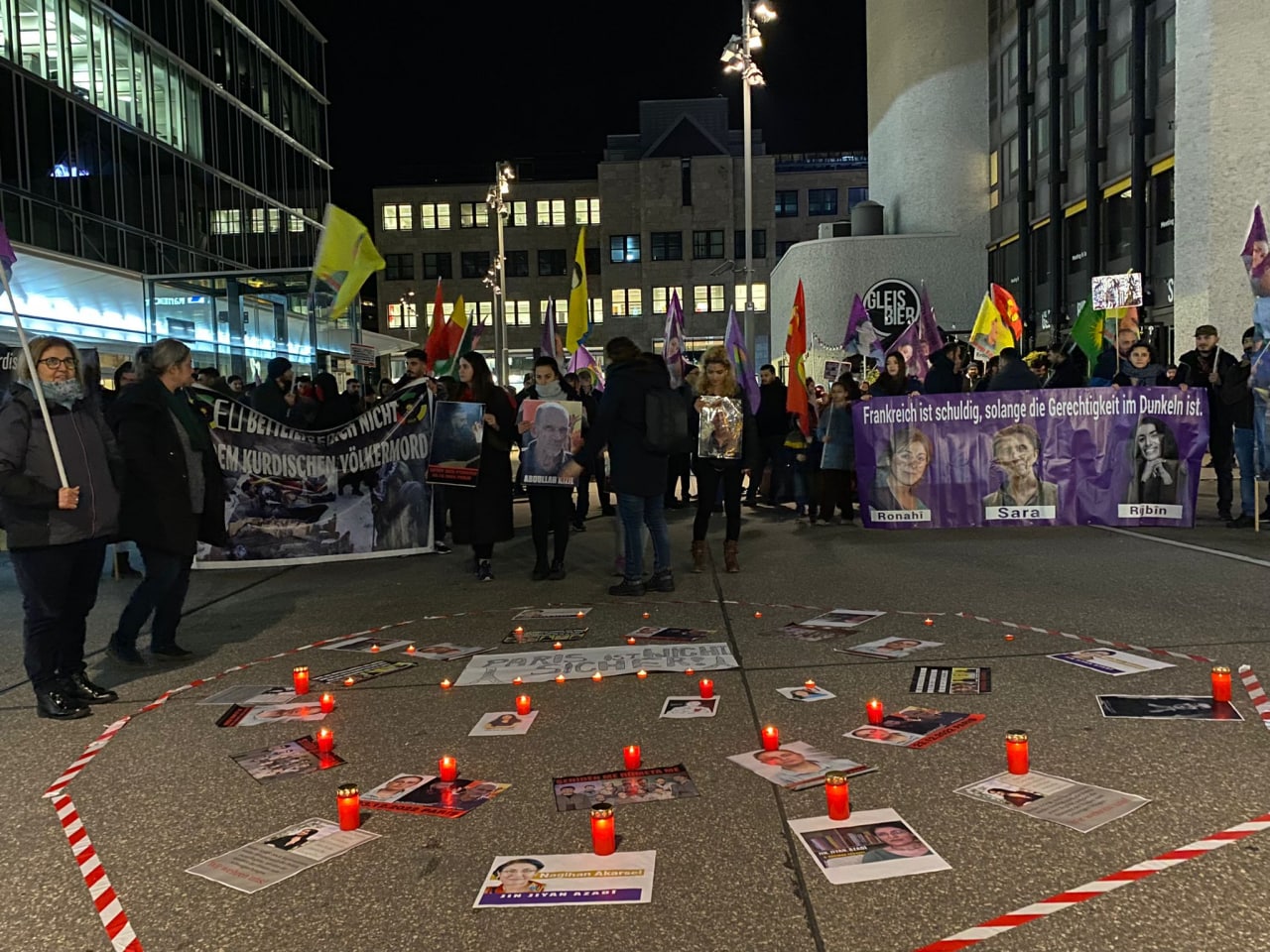 Eylem İkinci Paris Katliamı Şehitleri Evin Goyi, Mîr Perwer ve Abdurrahman Kızıl şahsında tüm devrim şehitleri için saygı duruşuyla başladı. Ardından KCDK- E’nin açıklaması okundu. Faşist Türk devletinin kadın şahsında, Kürt özgürlük savaşçılarına karşı her türlü saldırıyı yaptığını, ilgili kurumların görevlerini yapmadığı için Türk devletinin hala Kürdistan dağlarında savaş suçu işlemeye devam ettiğine vurgu yapılarak ilgili kurumları acil olarak göreve çağırdı. Eylem de ”ŞEHİT NAMİRİN”, ‘ ‘BİJİ SEROK APO” ,’ ‘BİJİ BERXWEDANA GERİLLA’ ‘, ”Terörist Erdoğan” sloganları atıldı.
