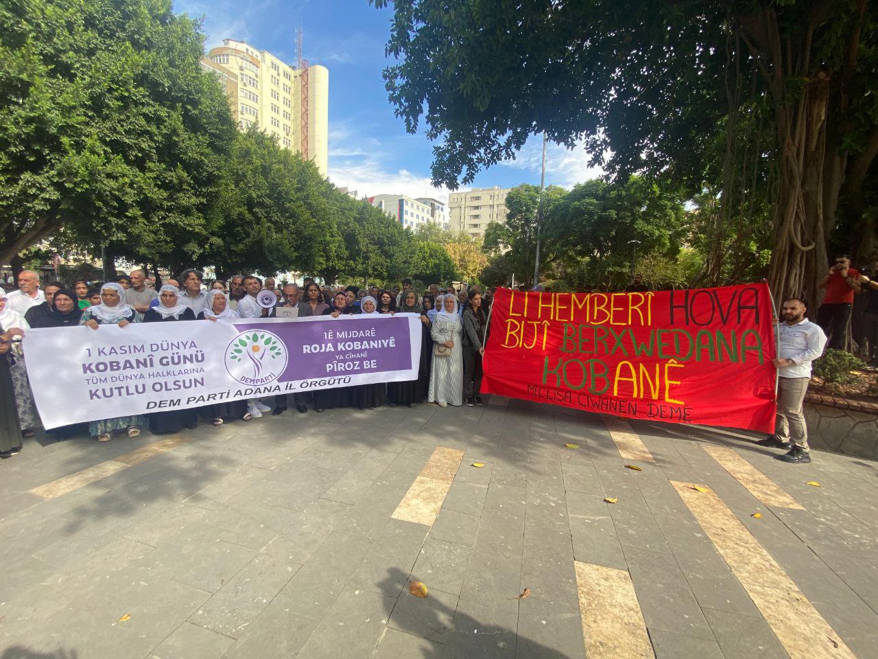 1 Kasım Dünya Kobanê Günü dolayısıyla Adana’da yapılan açıklamada  “1 Kasım Dünya Kobanê Günü Tüm Dünya Halklarına kutlu olsun” ve “Li Hemberî Hova Bijî Berxwedana Kobanê” pankartları açıldı ve sık sık “Biji berxwedana Kobanê” ve “Jin Jiyan Azadî” sloganları atıldı. Basın açıklamasını DEM Parti Adana İl Eşbaşkanı Seyfettin Aydemir okudu.