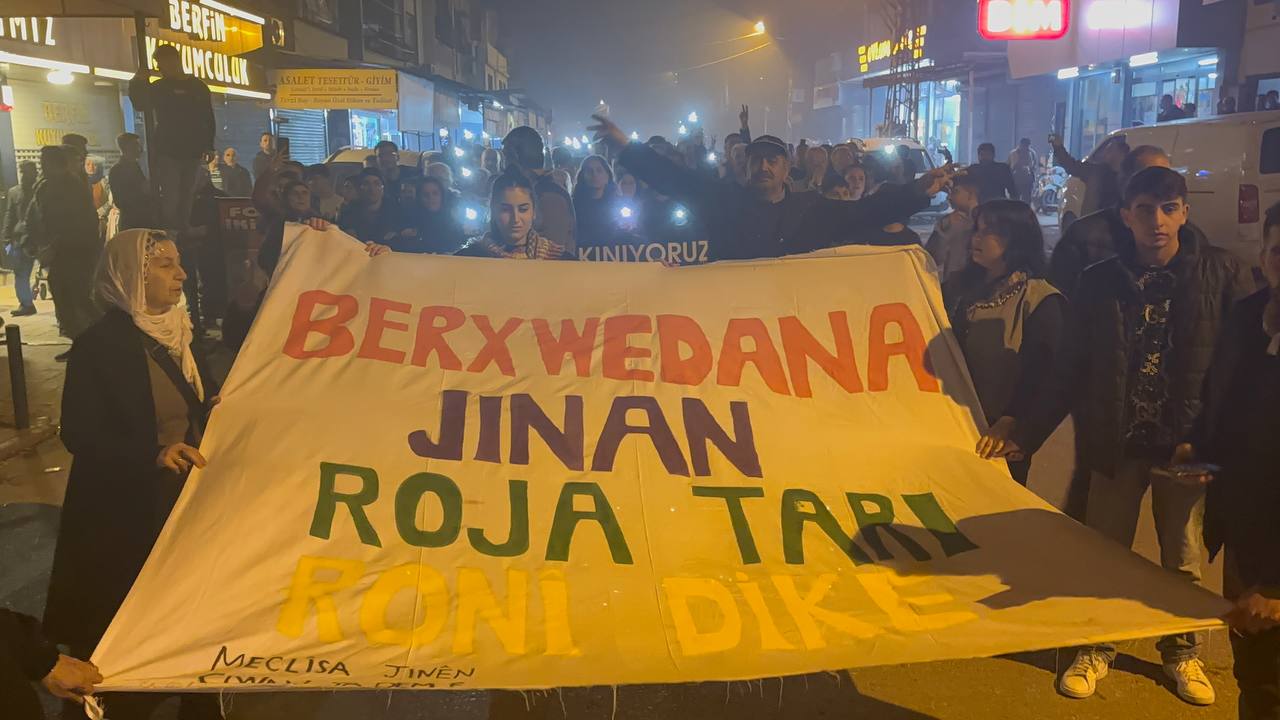 Polisin geri çekilmesi üzerine kitle ellerindeki telefonların flaşlarını açarak, alkış, zılgıt ve “Bê Serok jiyan nabe”, “Bijî Serok Apo”, “Savaşa hayır barış hemen şimdi”, “Yeke yeke gelê Kurd yek e”, “Jin jiyan azadî”, ve “Bi can bi xwîn em bi te re ne ey Serok” sloganları atarak yürüdü. Yürüyüşte bazı kadınlar sarı kırmızı yeşil fuarlar açarak yürüdü. Yürüyüşte yurttaşlar, telefonlarından Önder Apo’nun fotoğrafını açarak, “Bijî Serok Apo” sloganıyla yürüdü.